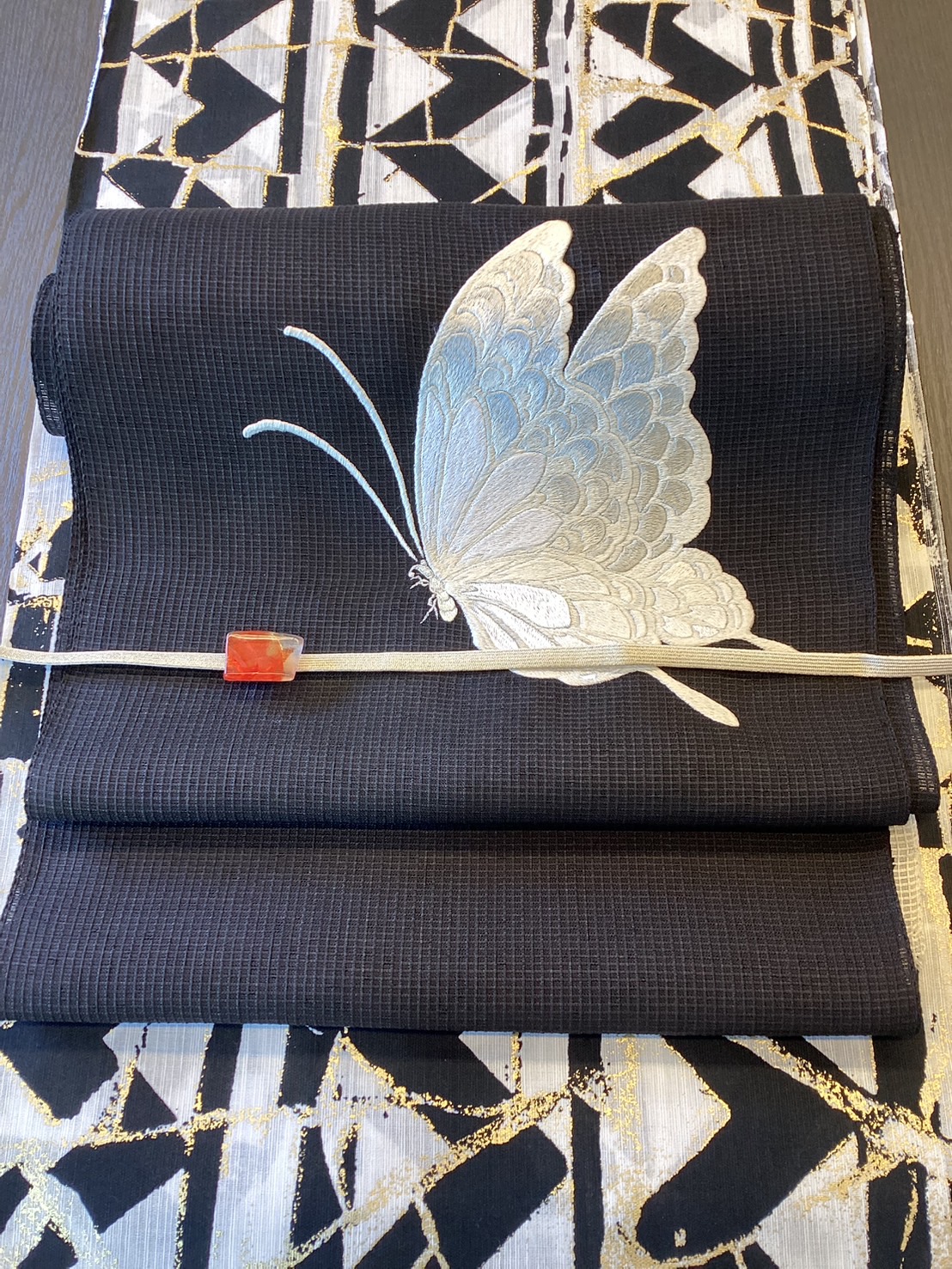 誉田屋源兵衛のモノクロの浴衣に、蝶の刺繍のモノクロの名古屋帯を合わせました。