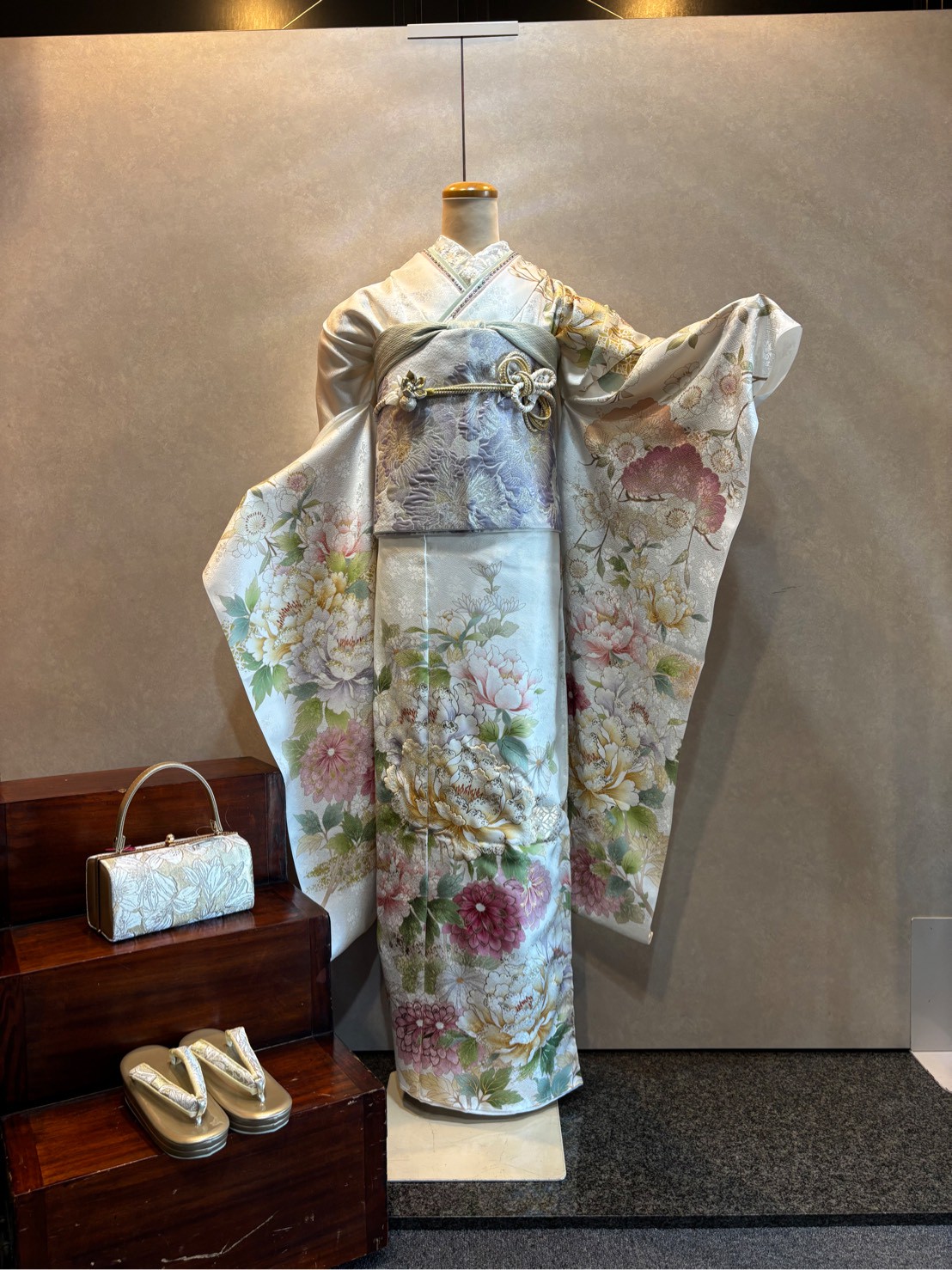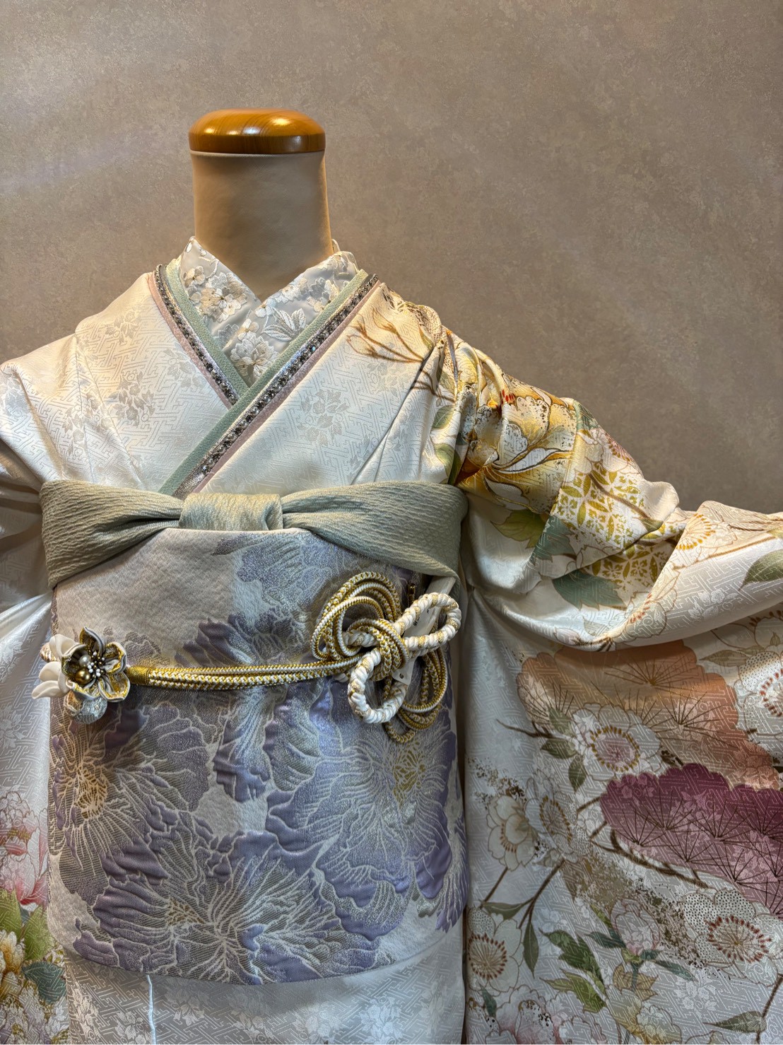 白地に牡丹、菊、桜、松が淡い色調で描かれたお振袖。