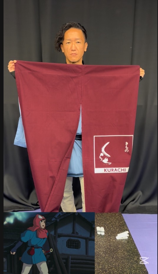 顔回りの頭巾みたいなのは、お店で使っている暖簾
