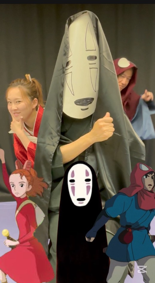 それを着物や身の回りにあるもので、ジブリのキャラクターに変身した3人で再現してみた。