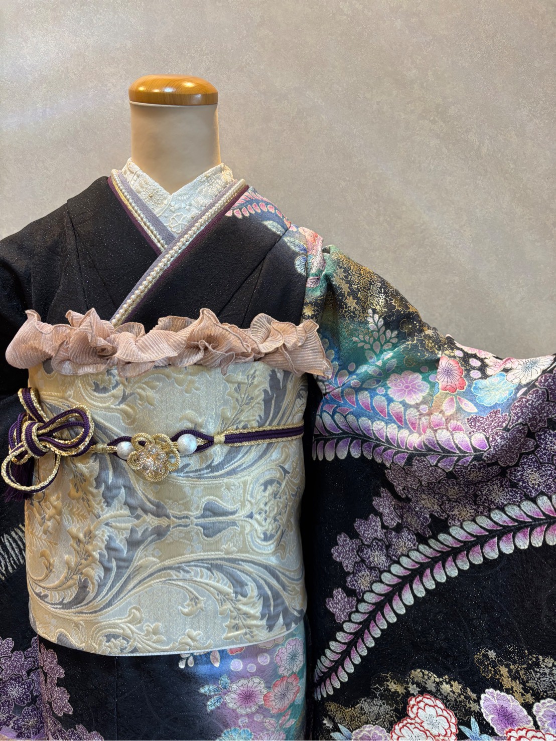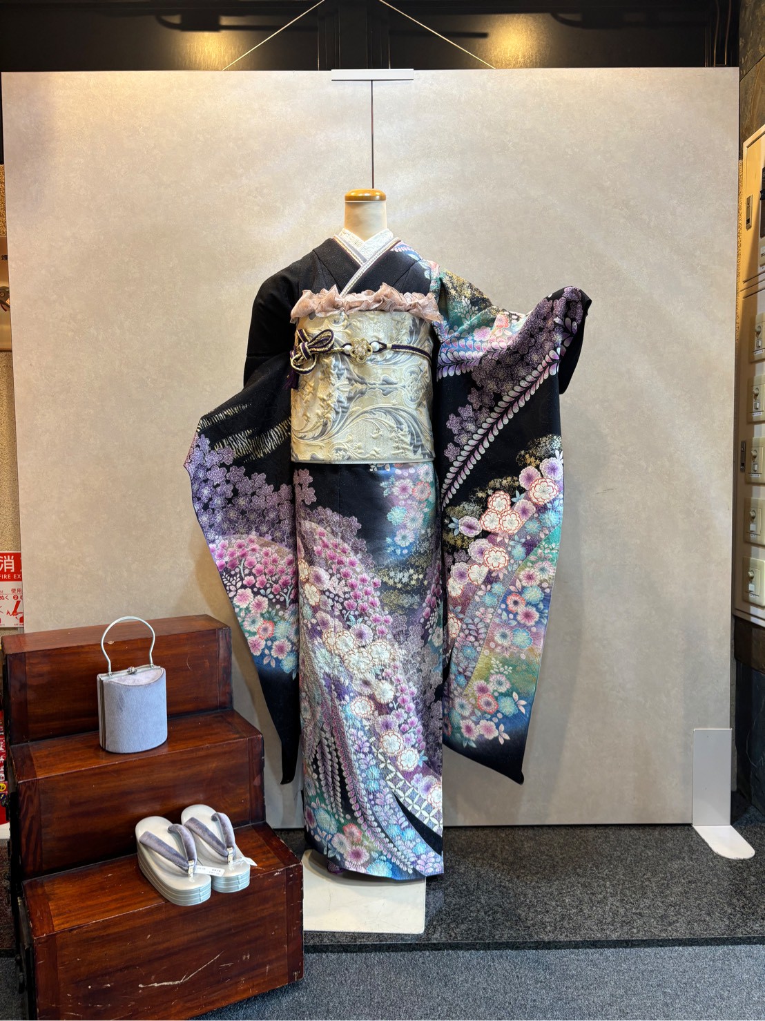 こちらのお振袖は黒地に紫や青、ピンク系の交じった色合いの辻が花。