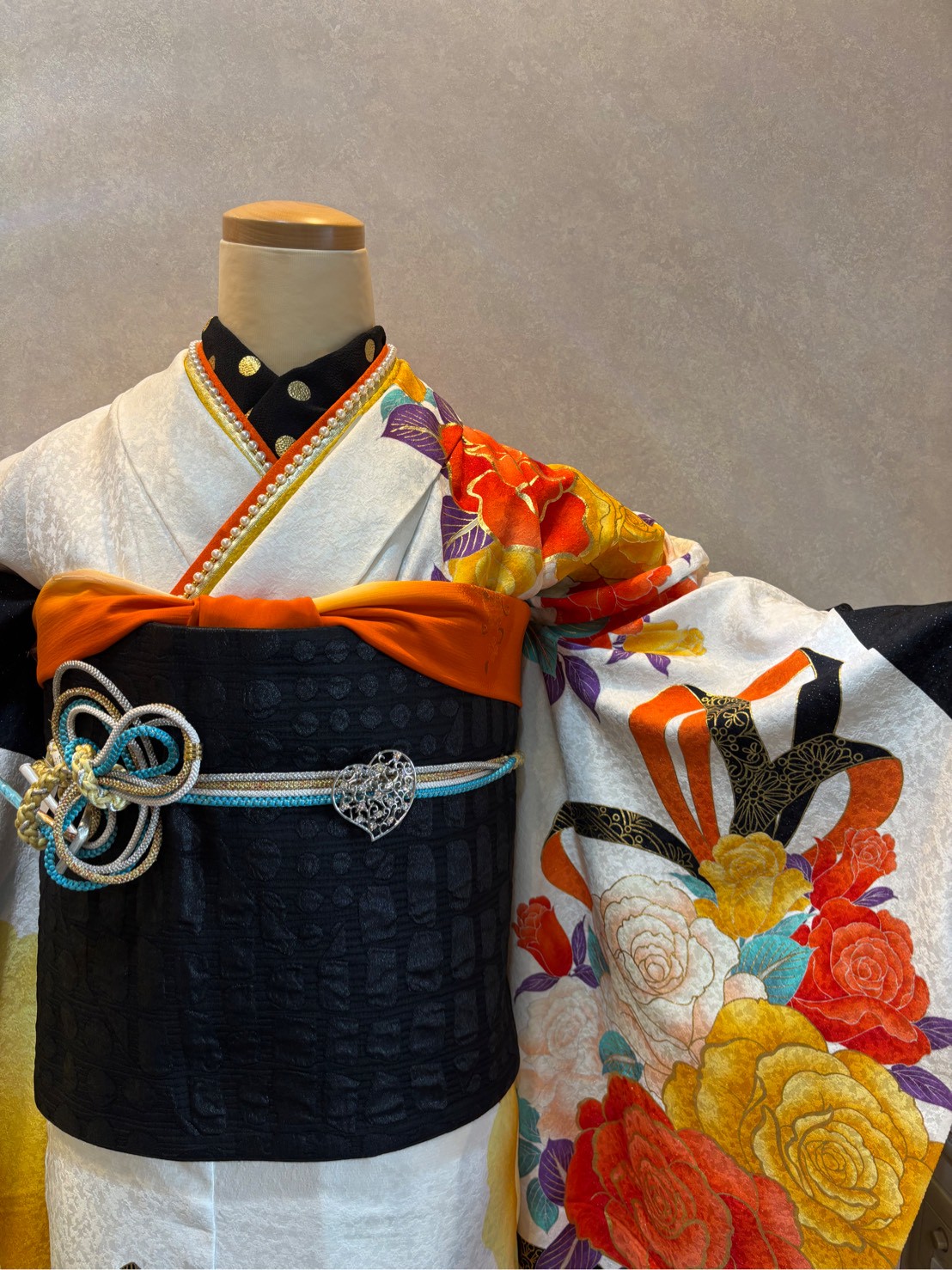 黒い半襟、帯を合わせてきりっとさせながらも、小物はオレンジ、黄色、水色でPOPにしました。