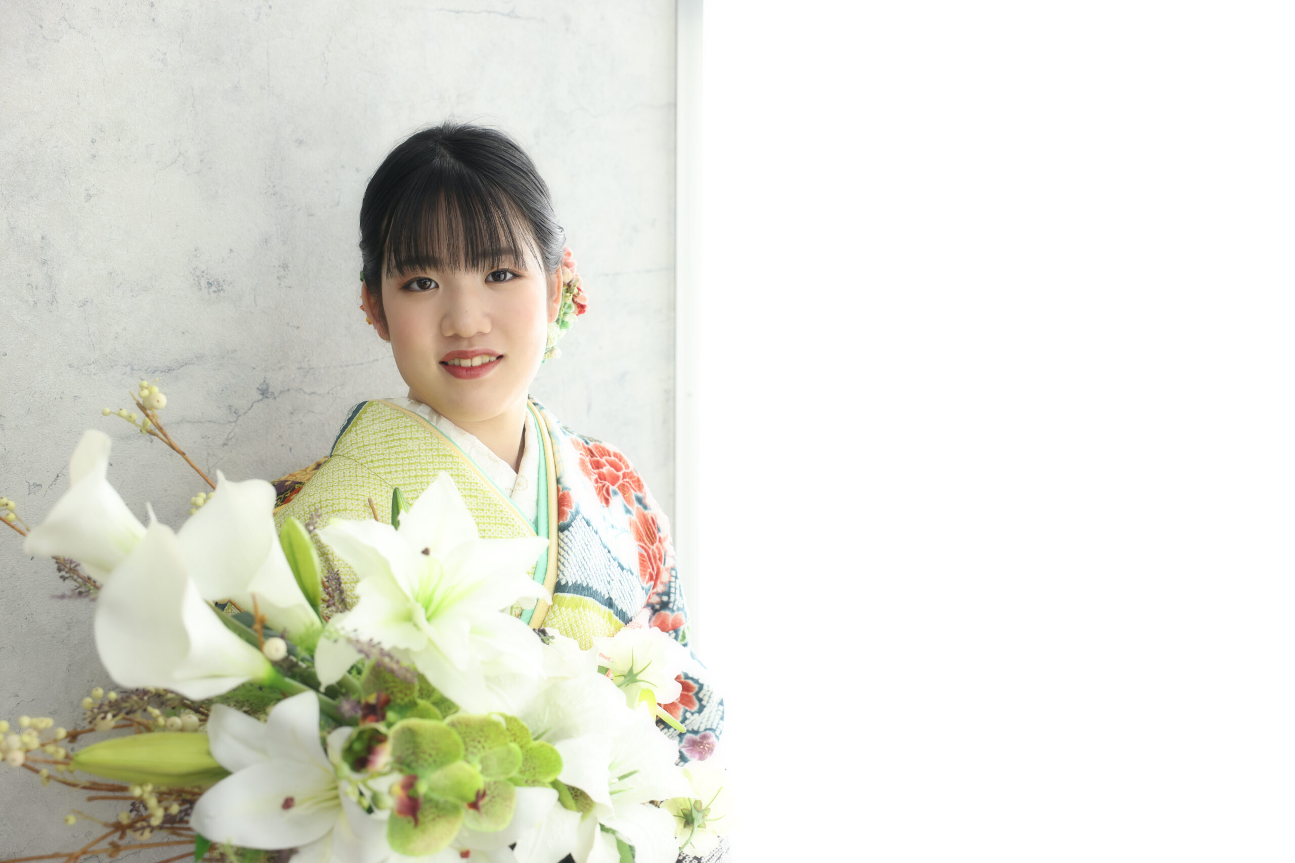 襟元の優しい色合わせがお嬢様の雰囲気に合っていますね。