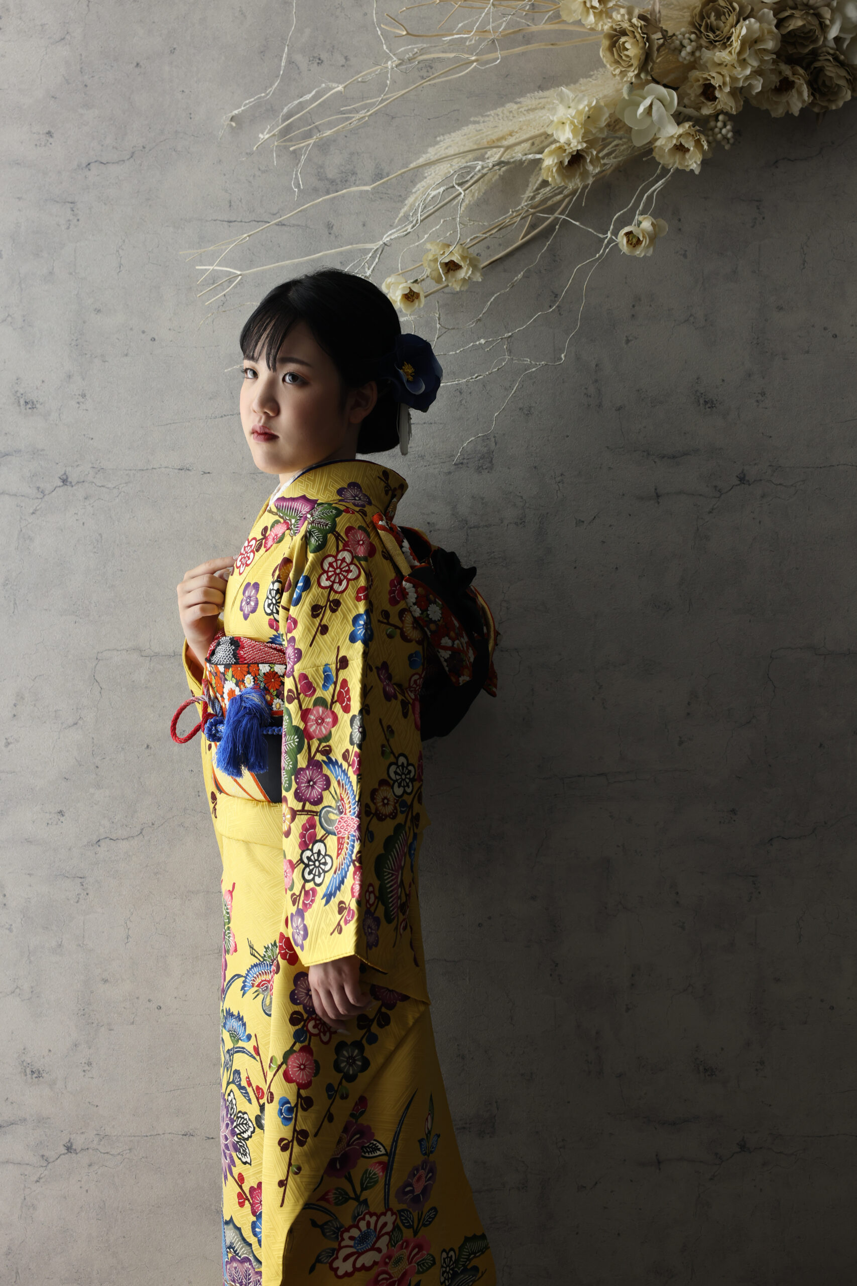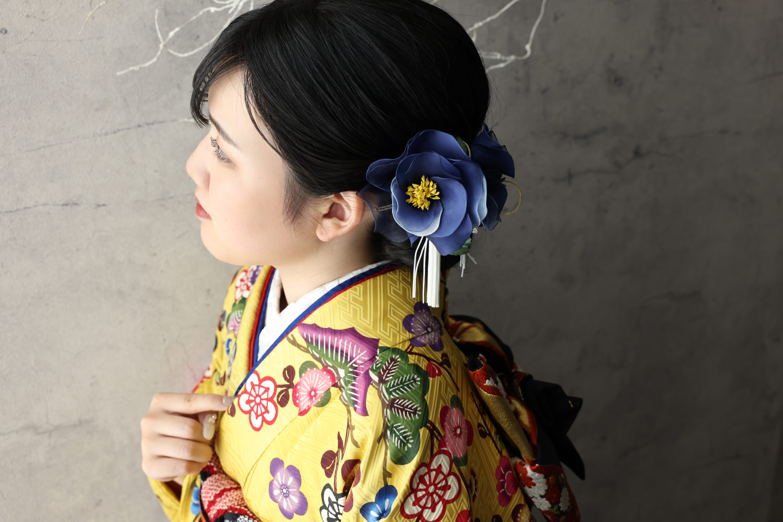 髪飾りや重衿に青色をきりっと入れることで、黄色の華やかさが際立ちますね✨