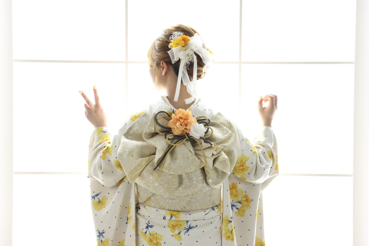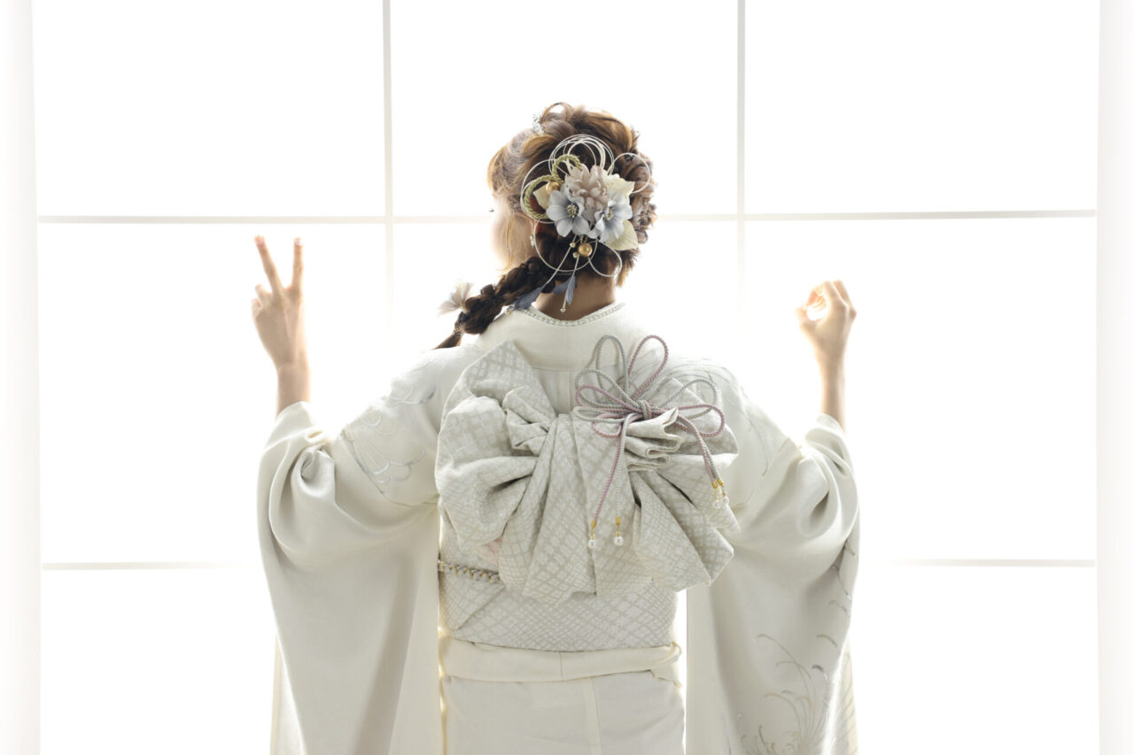 今回は、白地のお振袖を着用した、お嬢さまの後ろ姿をご紹介!