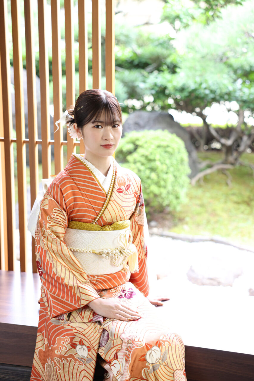 全体にしっかりと柄の入った、オレンジ色に波と橘の古典的なお振袖も、半襟や帯を白でまとめて、効かし色を辛子色にまとめたことで、すっきりとしたコーディネイトがお嬢様の雰囲気にとても合っています。着物は柄が多くて、帯はすっきり、今のお嬢様に人気のコーディネイトです。