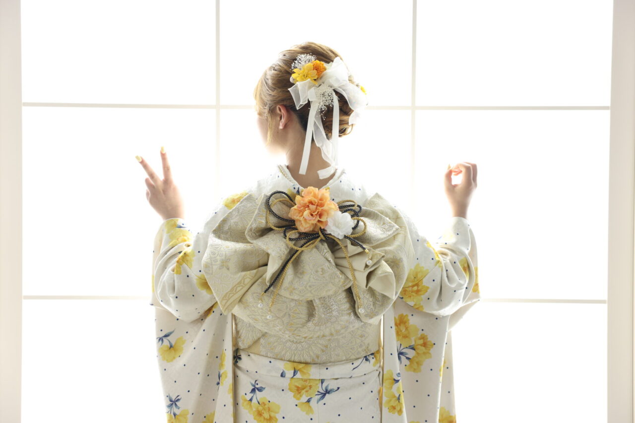 黄色の花がちりばめられた振袖をキュートにコーデしていただいたお嬢様の髪飾りは、黄色い花、リボンやカスミ草を合わせて💛