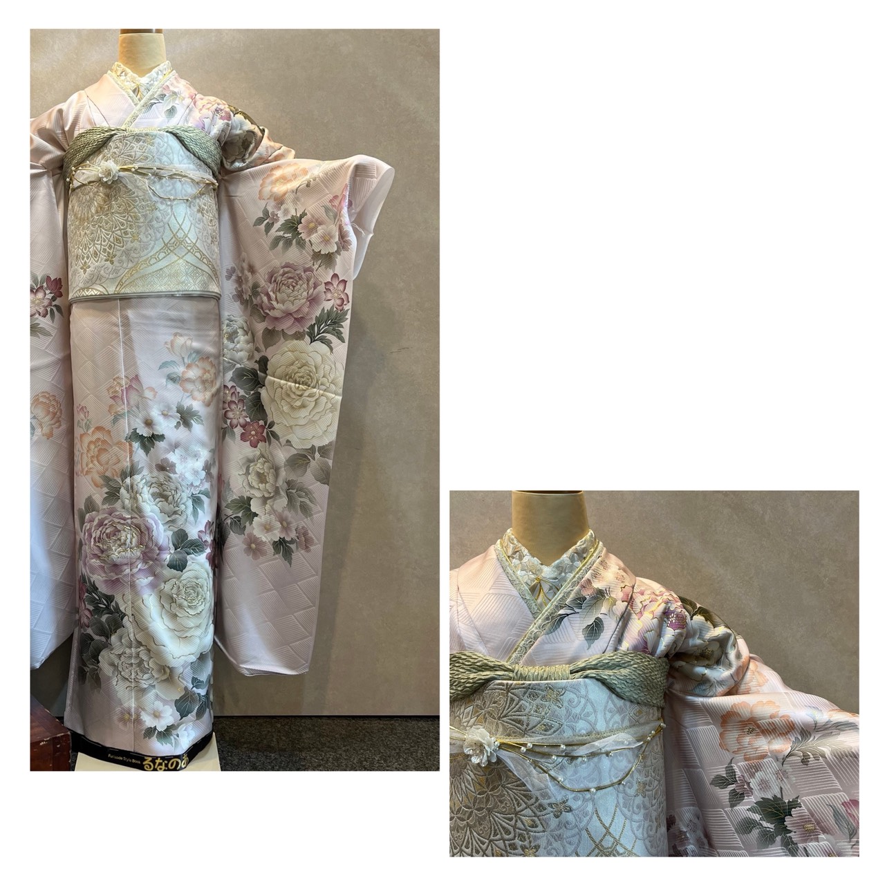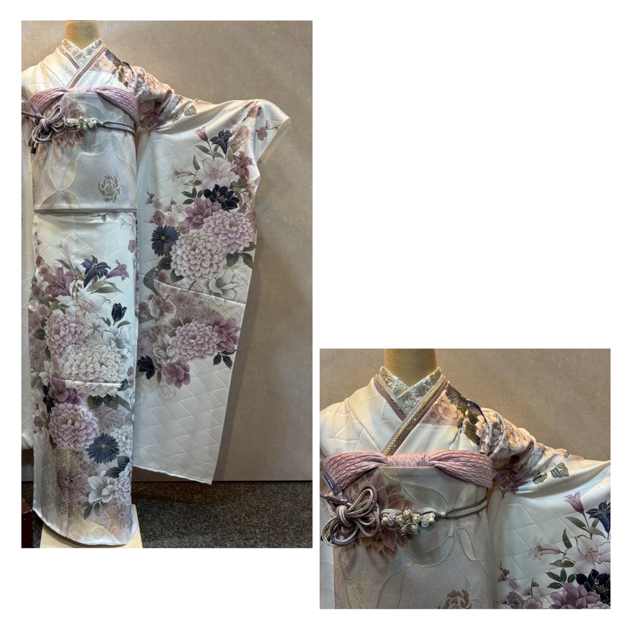 淡いピンク色に薔薇が描かれていますが、柔らかい印象の色味とデザインでとってもラブリー💕レースとパールを使った帯締めも可愛い💗