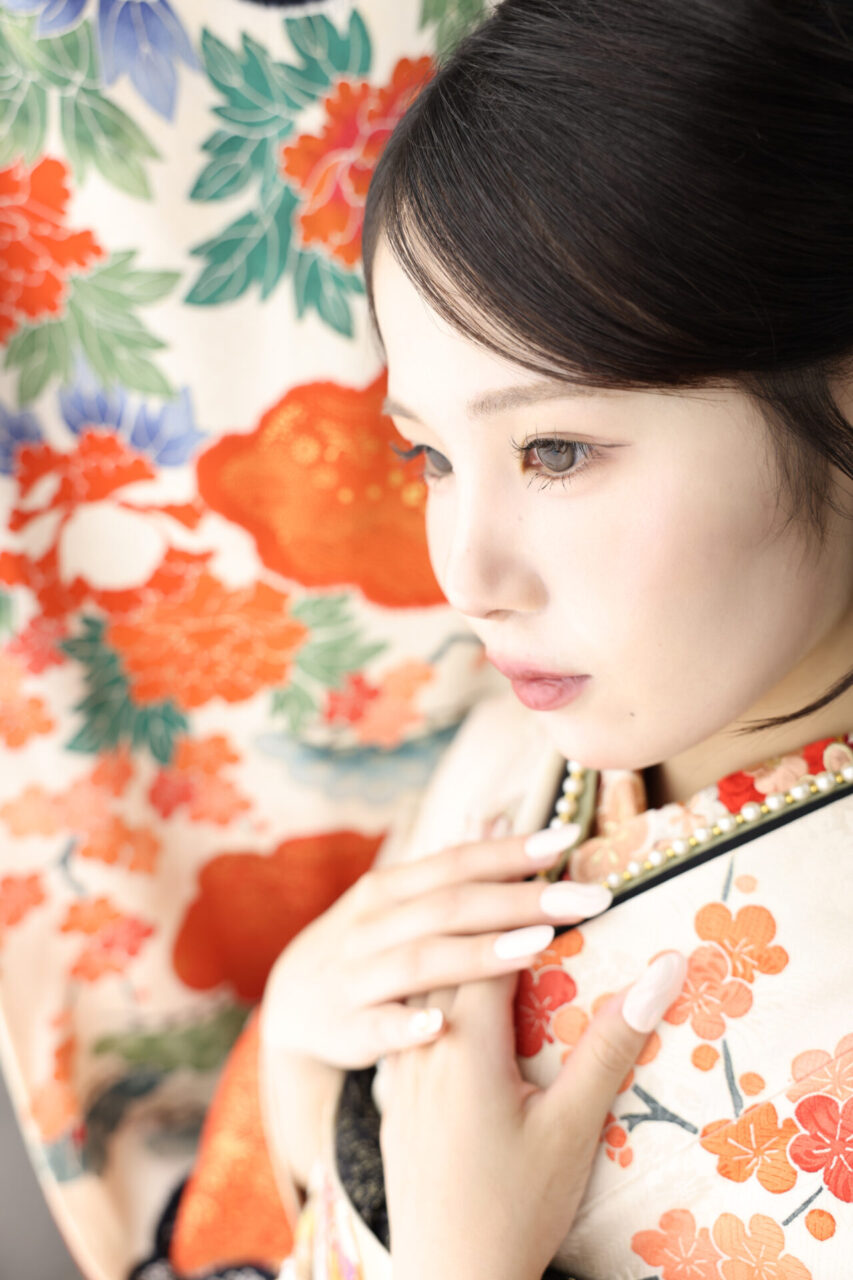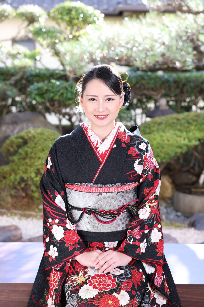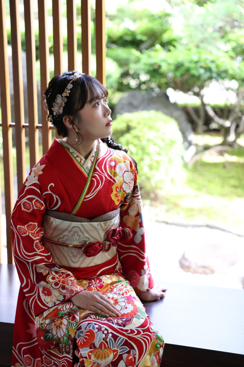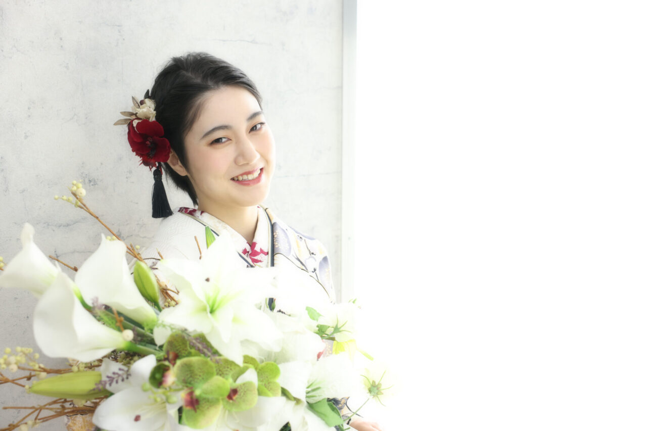 モノトーンのお振袖に半襟や髪飾りなどポイントに赤の差し色を入れて、華やかさをプラス。