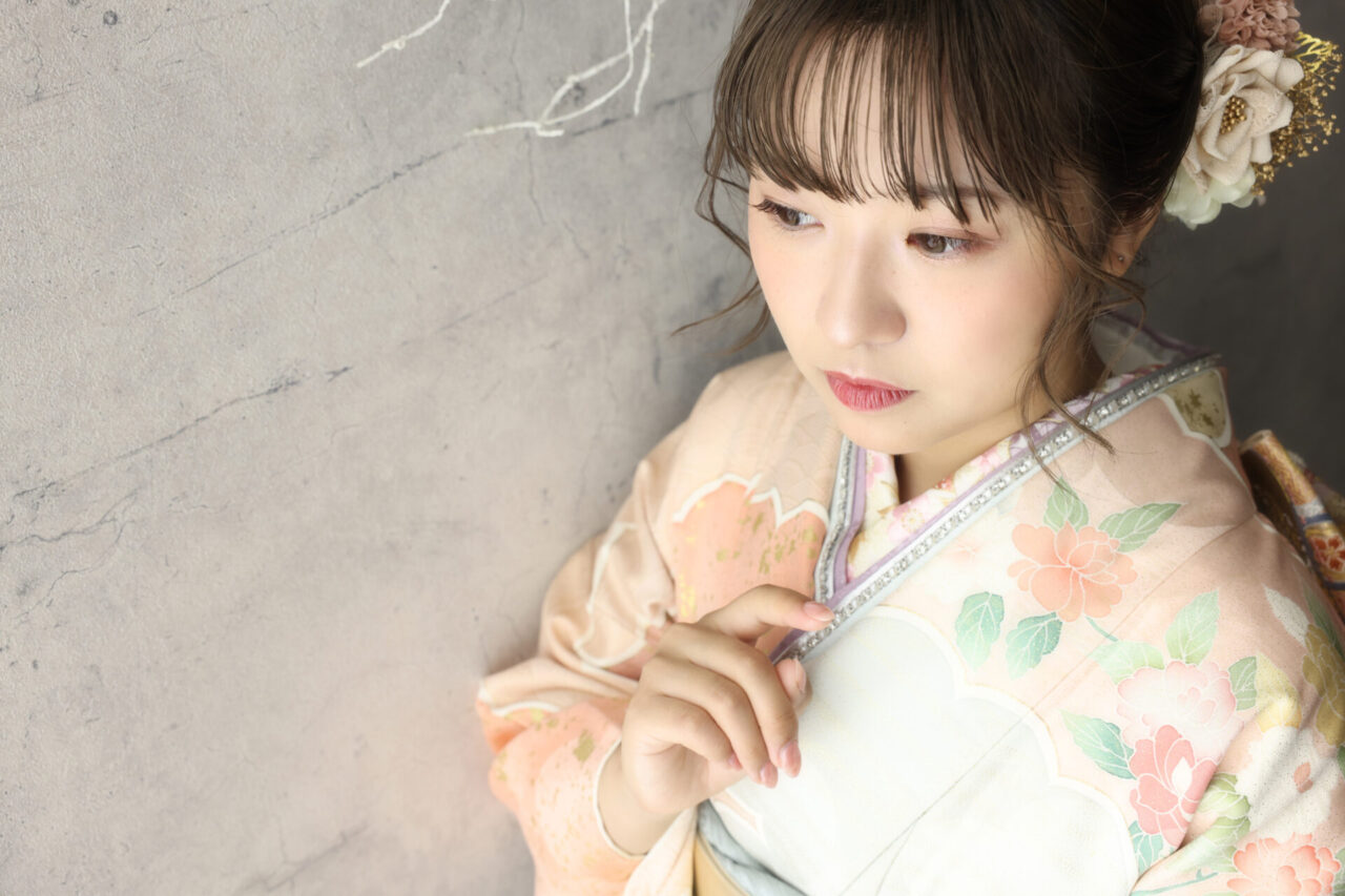 パステルカラーのお振袖に同系色の半襟で上品さをプラス