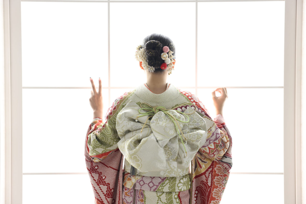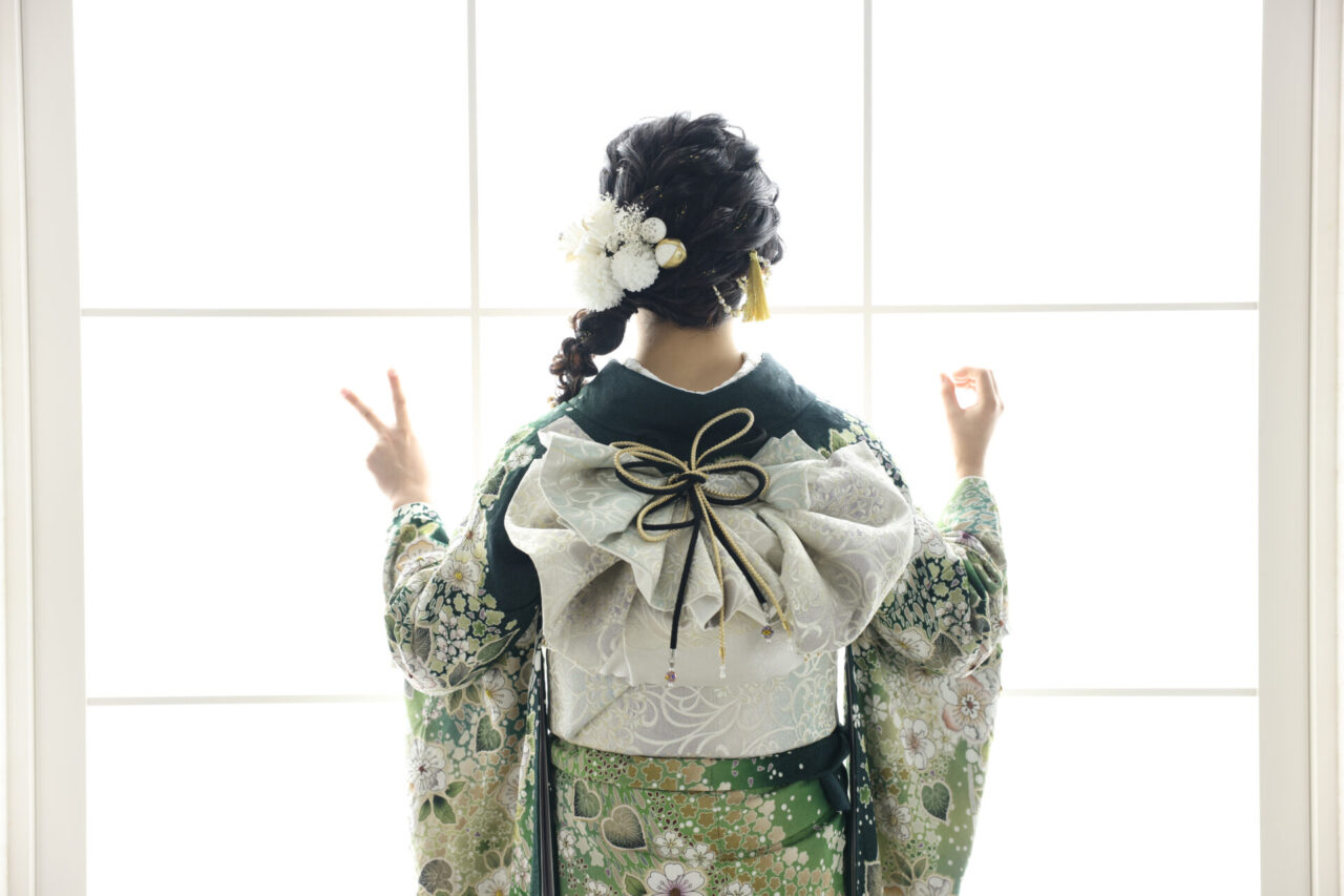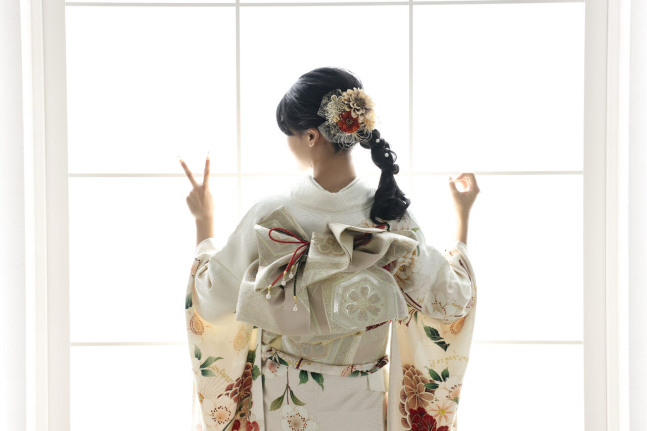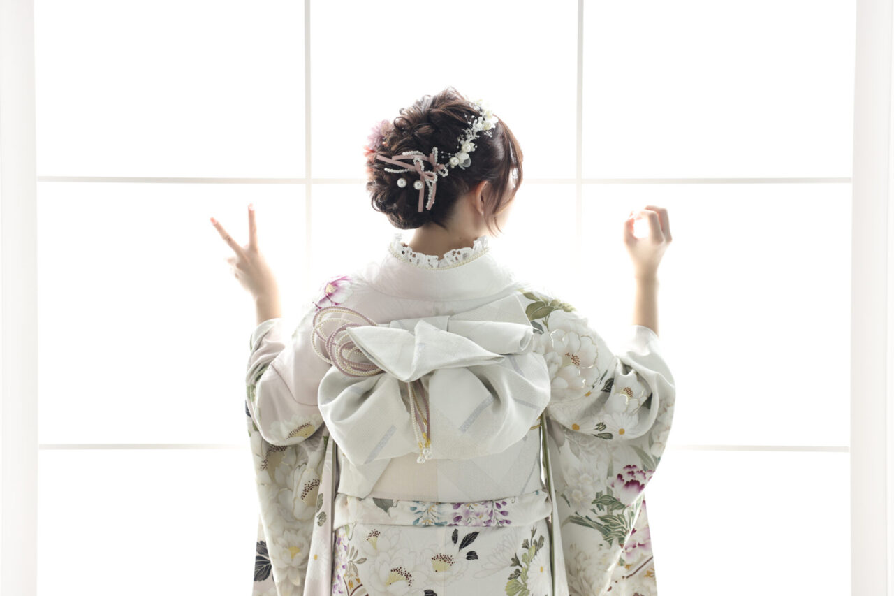 というのも、淡い色のお振袖が増えてきたので、黒っぽい帯をすると、上下が分断されてしまうような感じになるので、白い帯で、Iラインを作るイメージでコーディネイトするのがイマドキです。