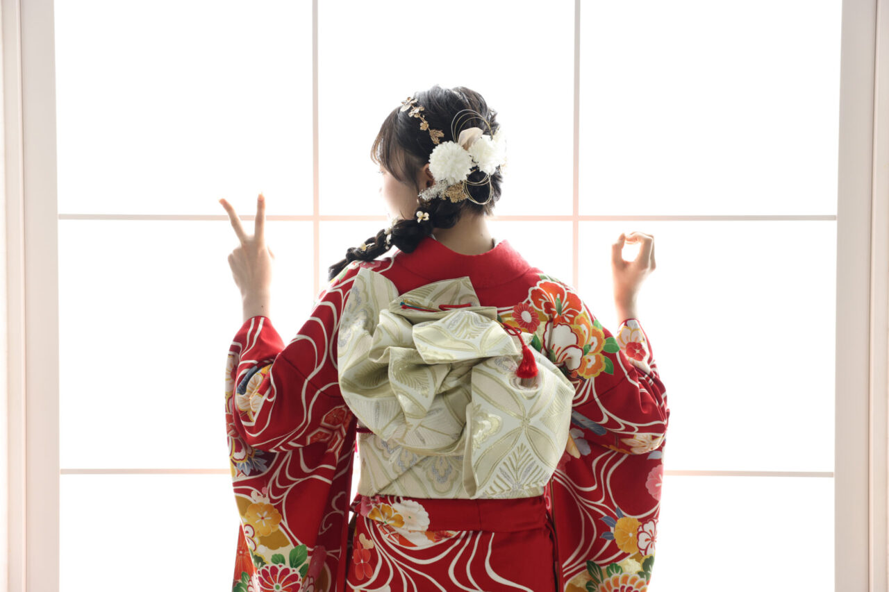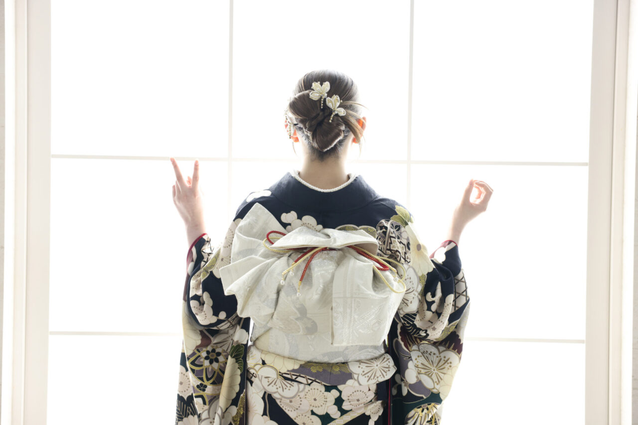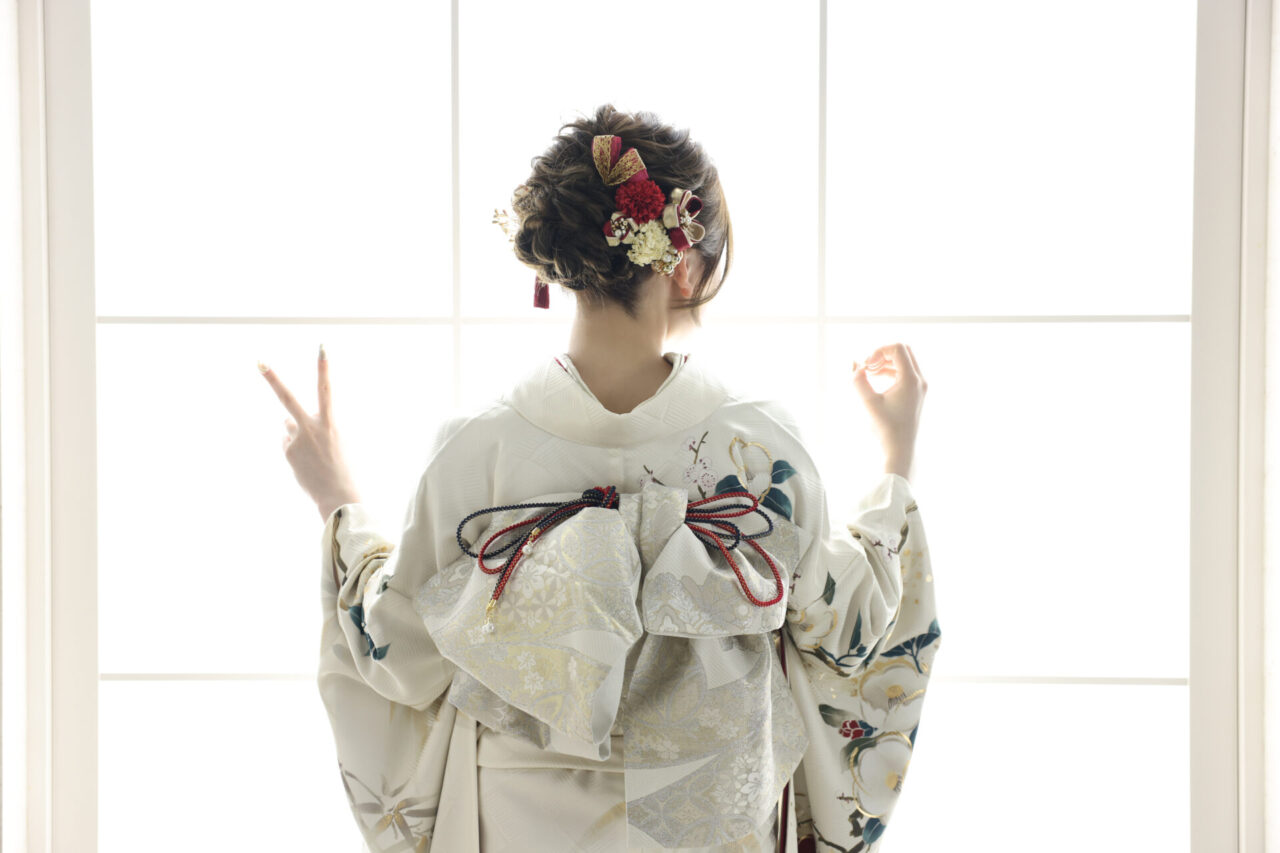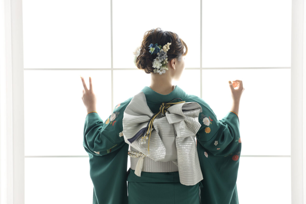 というのも、淡い色のお振袖が増えてきたので、黒っぽい帯をすると、上下が分断されてしまうような感じになるので、白い帯で、Iラインを作るイメージでコーディネイトするのがイマドキです。