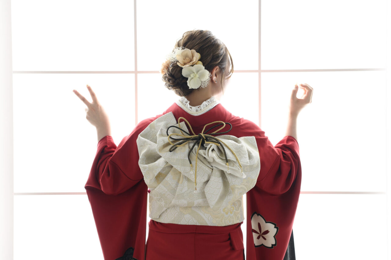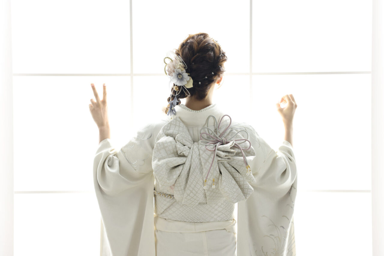 正面からは、衿や、重衿、帯揚げ、帯締めなどの小物で、飾りもたっぷりですが、後ろは着物と帯、髪飾りのみなので、そんな白い帯に、帯飾りをつけることで華やかさと、可愛らしさがアップします。