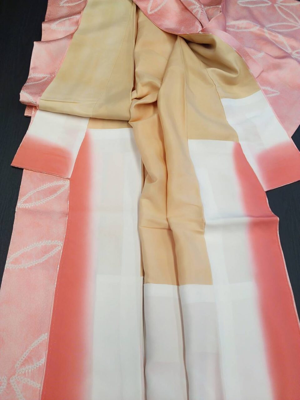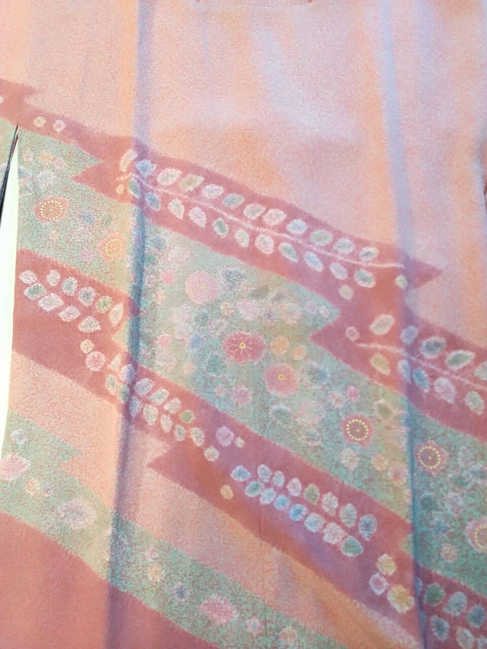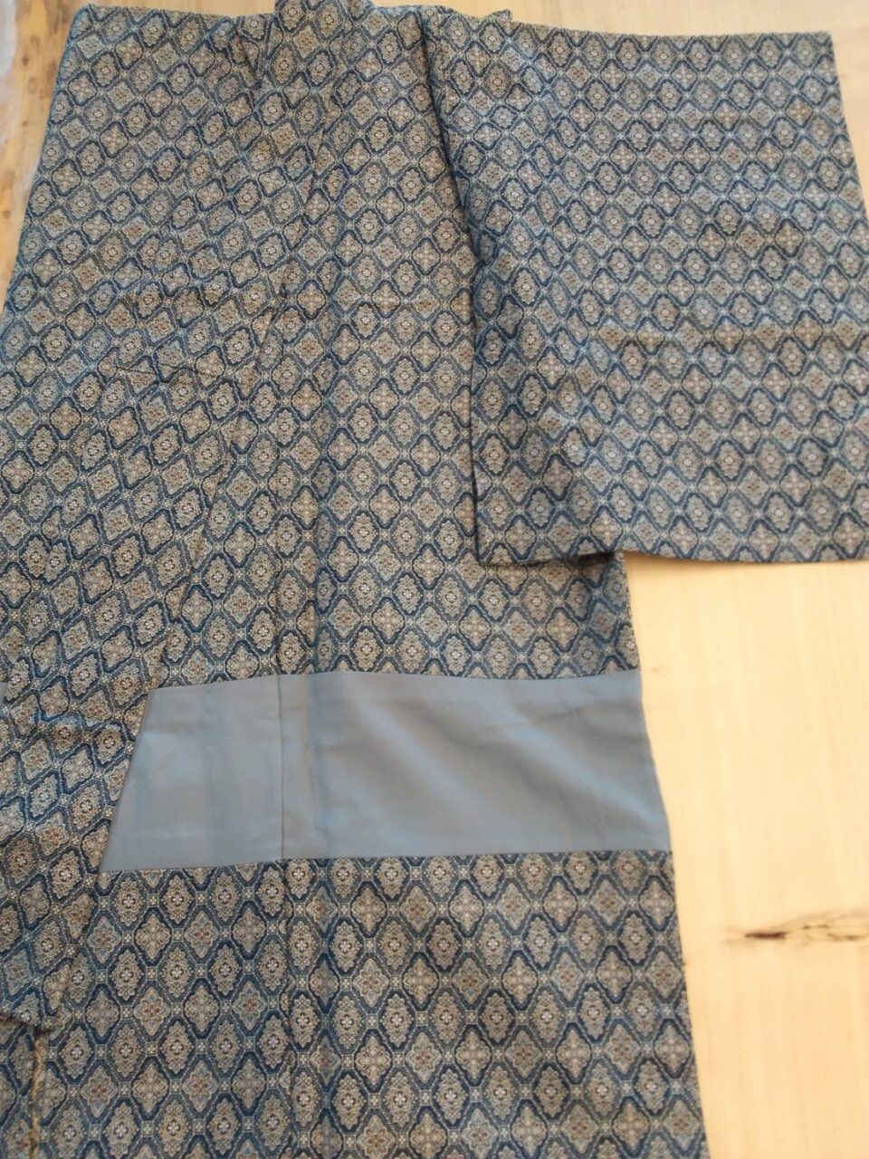 小さくするのは、ほどいて小さくするだけなのですが、身丈を伸ばしたい場合は、10センチぐらいの身長差なら、お腹部分に違う布を継いで仕立てることができます。着付けてしまえば、帯の下に継いだ生地が隠れるのでわかりませんよ。