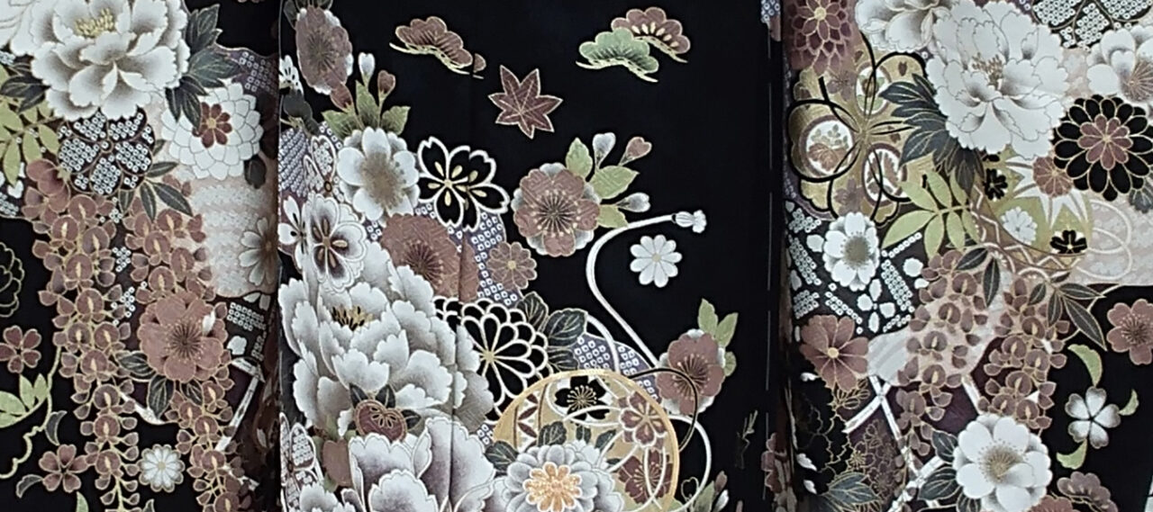 黒地に落ち着いた紫、茶系で描かれた古典のお振袖。 若々しく着るなら、赤や明るい... -