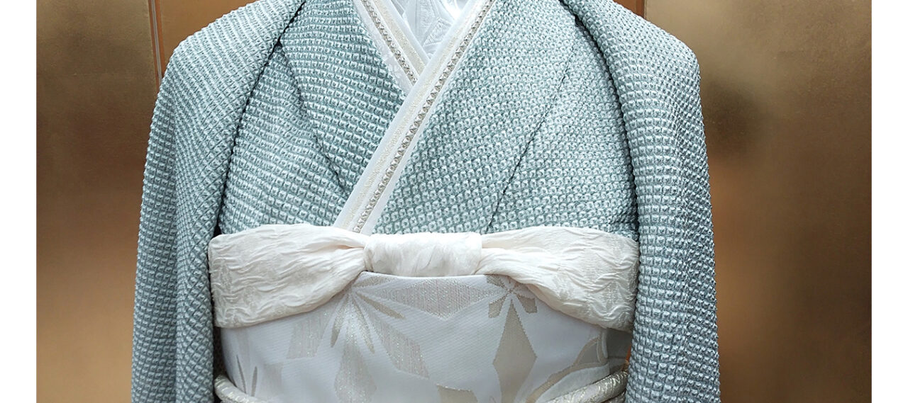 当店オリジナルの総絞りのお振袖。 くすんだ水色に染め上げてから、糸をほどいて、... -