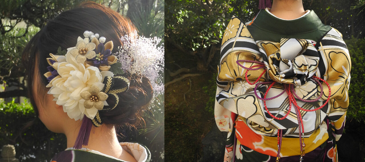 深い緑色と、江戸紫、辛子色の大正モダンなお振袖を選んで頂いたお嬢さま。 大胆に... -