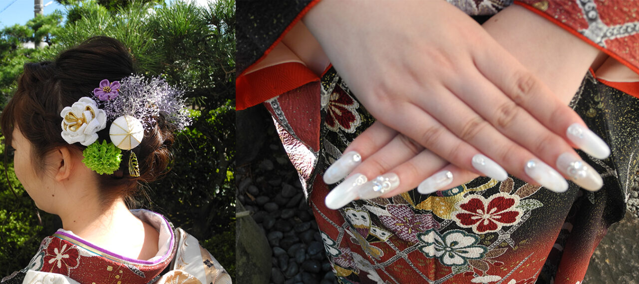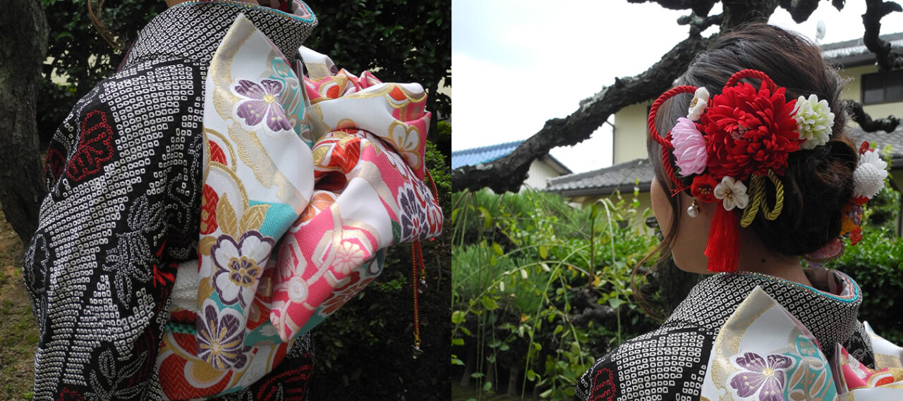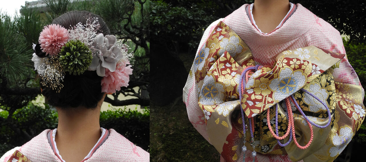お姉様の可愛らしい色合いのお振袖の中から、色合わせをして小物をコーディネイト... -