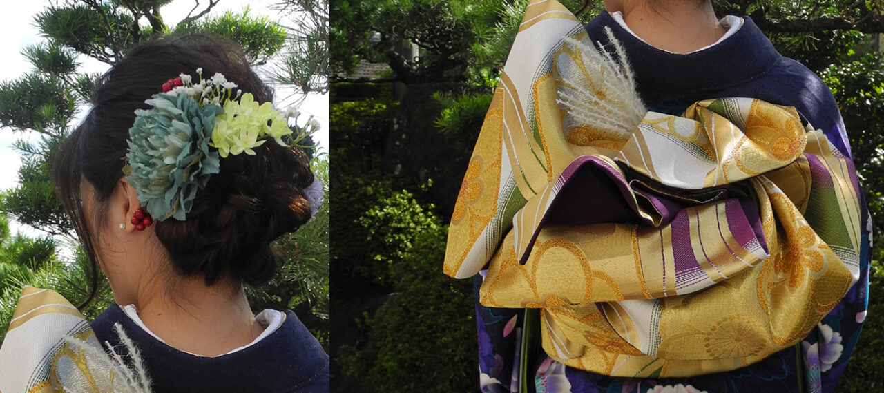 お母様の蝶と桜柄のお振袖に小物合わせをしていただいたお嬢さま。 小物はターコイ... -