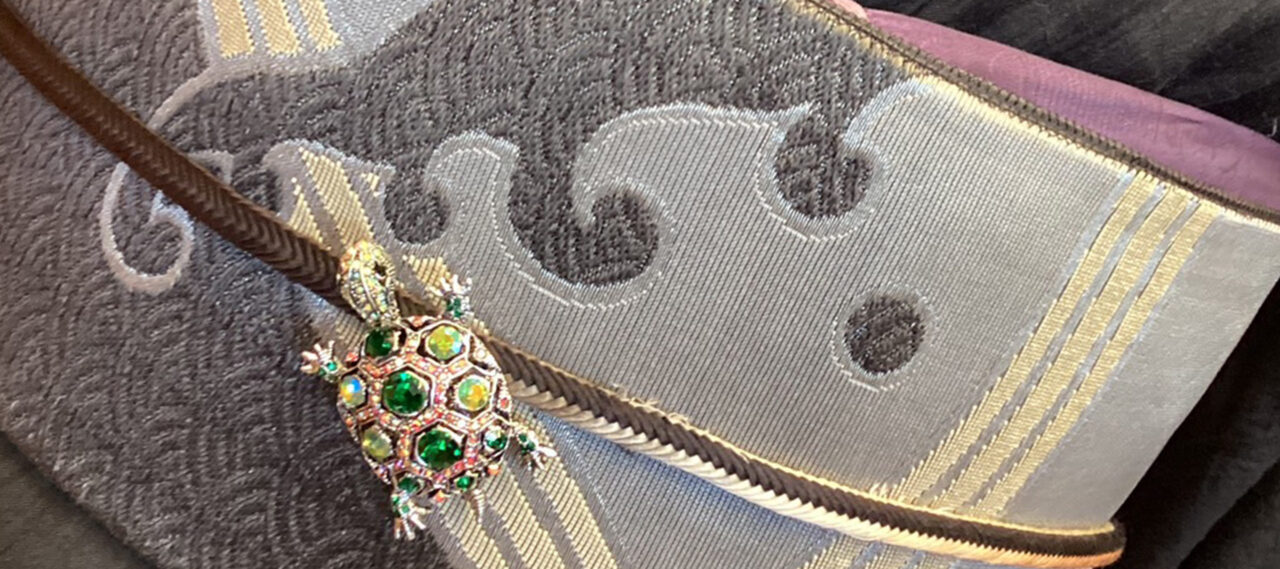波柄の帯に、亀の帯留めを合わせて、浦島太郎を連想さるコーディネイトにしました...
