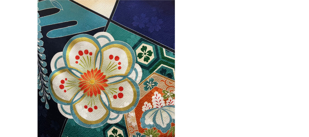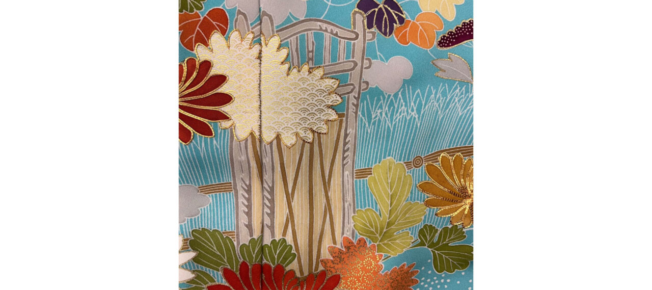 紺色に切り返しが幾何学模様で入っていて、竹、橘、梅、松などが青系で描かれてい... -