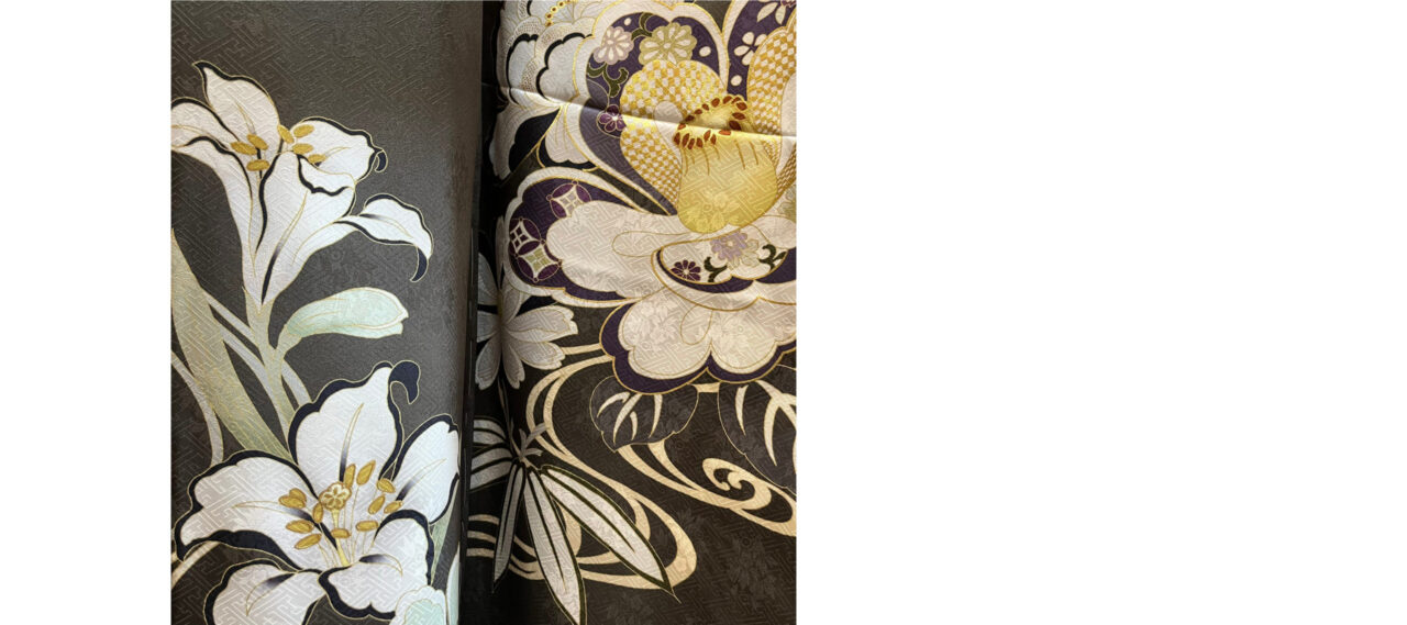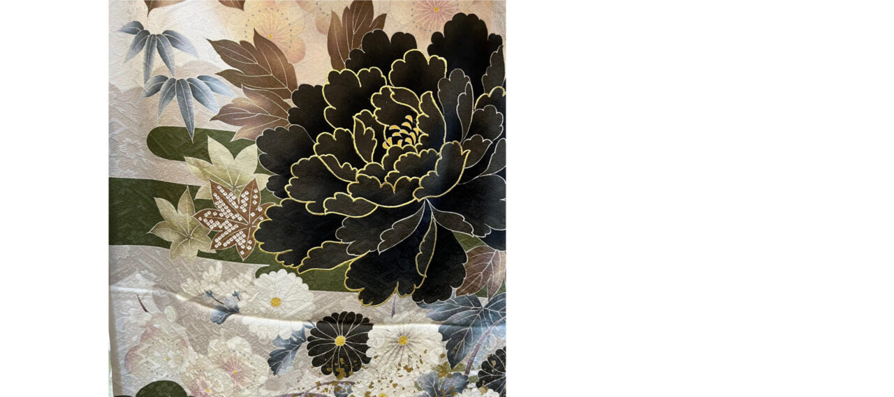 練色のお振袖に大きく、椿や牡丹がモノトーンで描かれ、裾は苔色。 パーソナルカラ... -