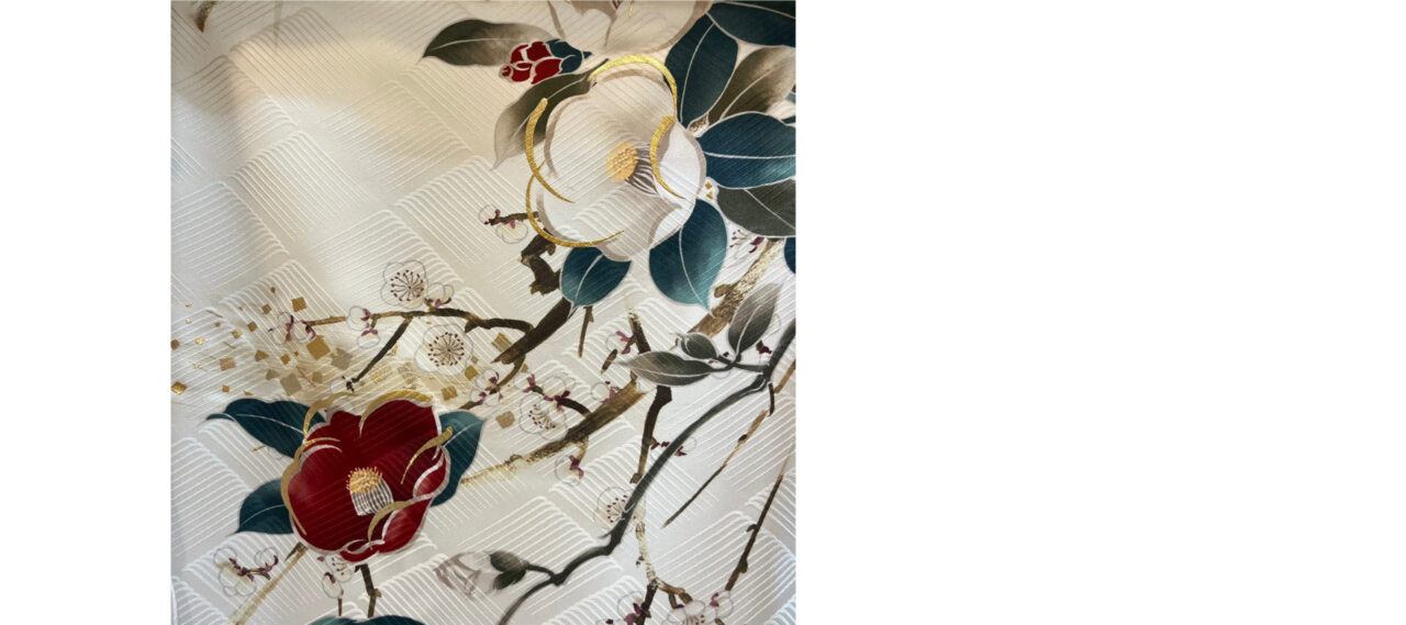 胡粉色(ごふんいろ)に椿、梅、竹が絵画のように描かれた、お振袖。 掛け軸のよう... -