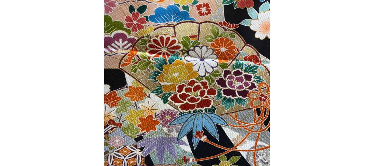 黒地に華やかな色合いで描かれた熨斗と檜扇。 柄が多いため、黒地部分が少なく、強...
