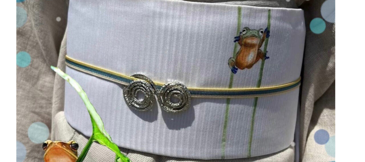 カエル好き三人が集まりました。 全員、ベージュ系の単衣の着物でコーディネイト。... -