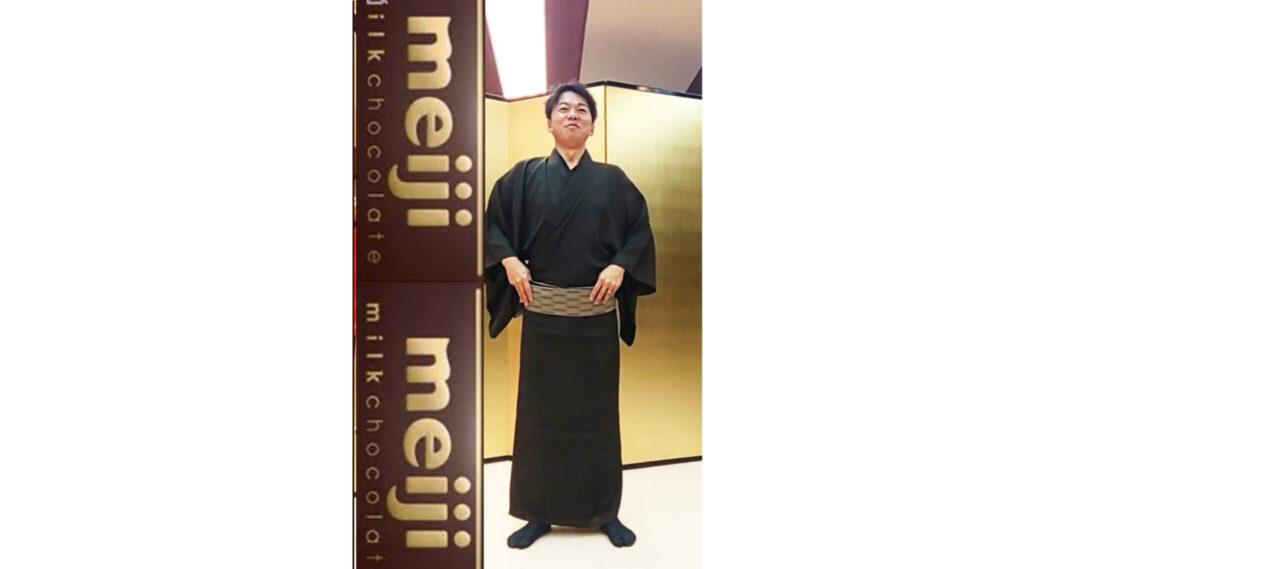 外国人旅行客に人気の明治ミルクチョコレート。 茶色の着物に、ゴールドっぽい帯を... -