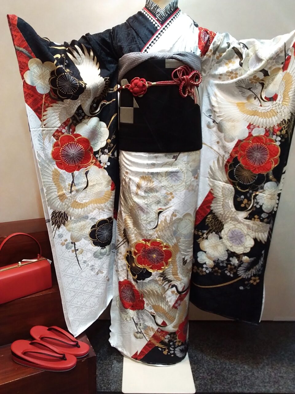 真っ白なお振袖に大胆に鶴と梅が描かれたお振袖。 両肩の色が違うので、左右からの... -