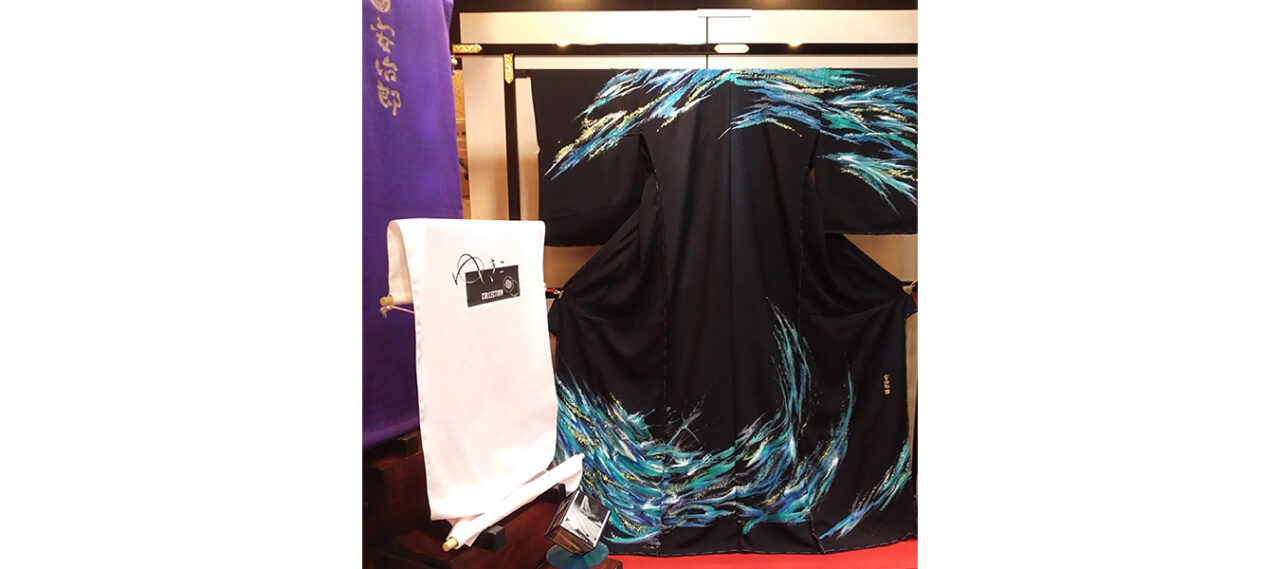 紺地に華やかな柄を選んで頂いたお嬢様。 紺地に、赤や辛子色がキリッと効いたデザ... -