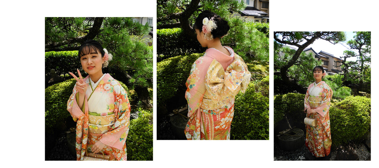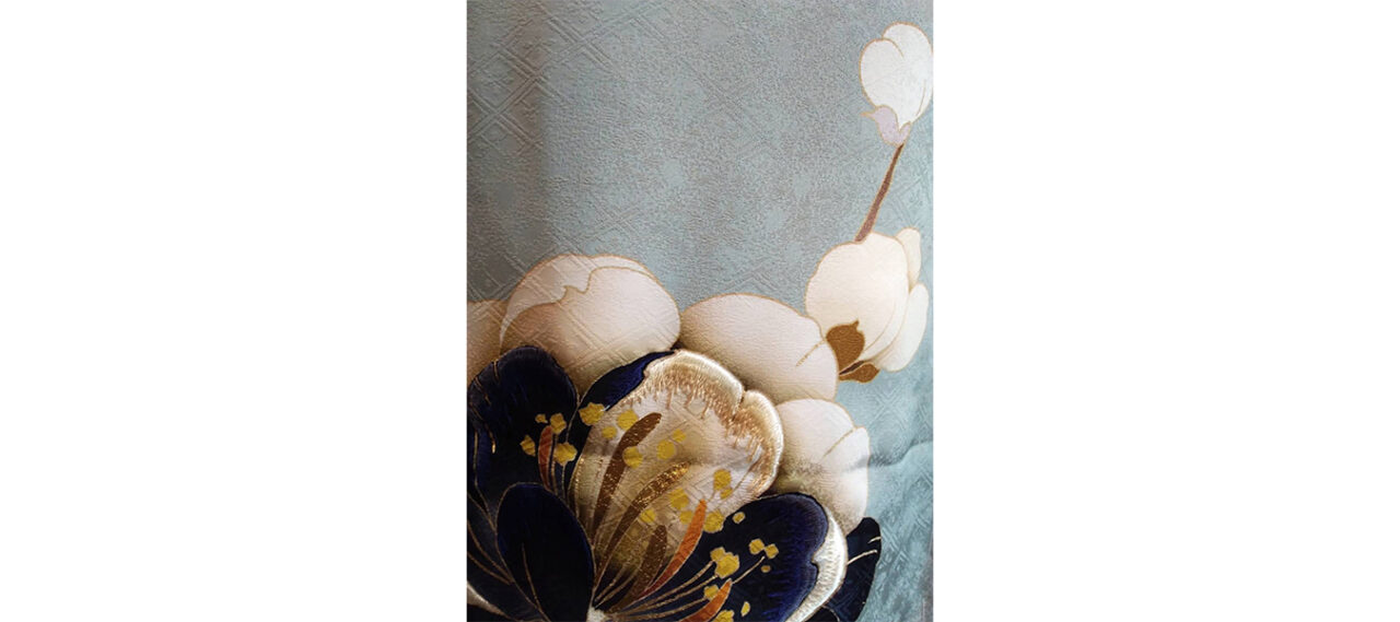 青磁色のお振袖には、裾に鉄紺色の梅。 後ろ姿は白磁色で桜が流れるように描かれて... -