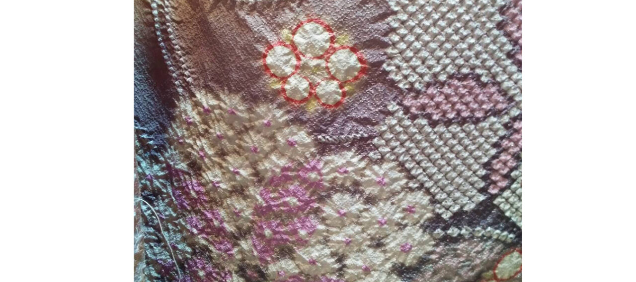 肩は、珊瑚色。裾は源氏鼠(げんじねず)色。 絞りの模様が素敵。青磁鼠色の帯を合... -