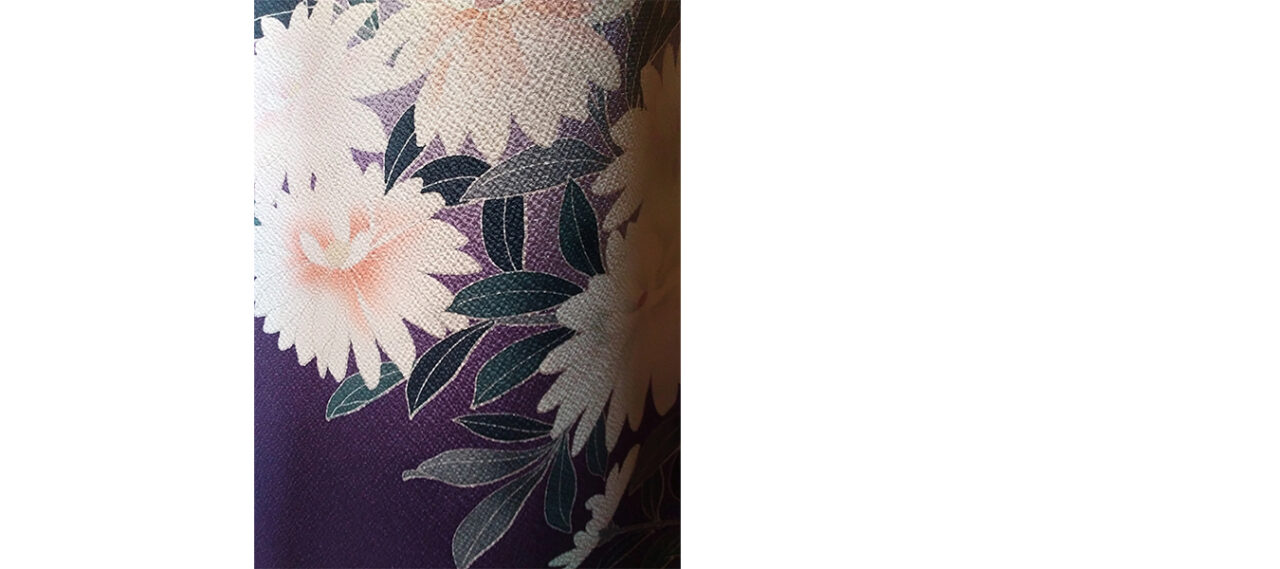藤黄色に紫苑色(しおんいろ)の裾に向かうグラデーションに菊科のお花が描かれて... -