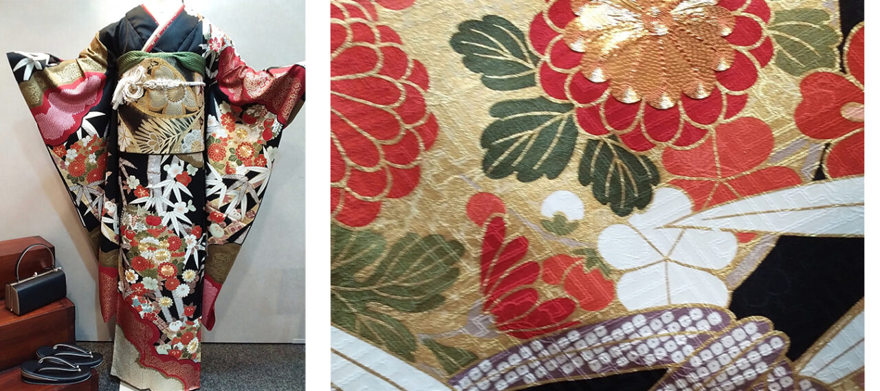 赤、黒の絞りに金駒刺繍と色んな手法が組み込まれたお振袖。 色鮮やかなお振袖にも... -
