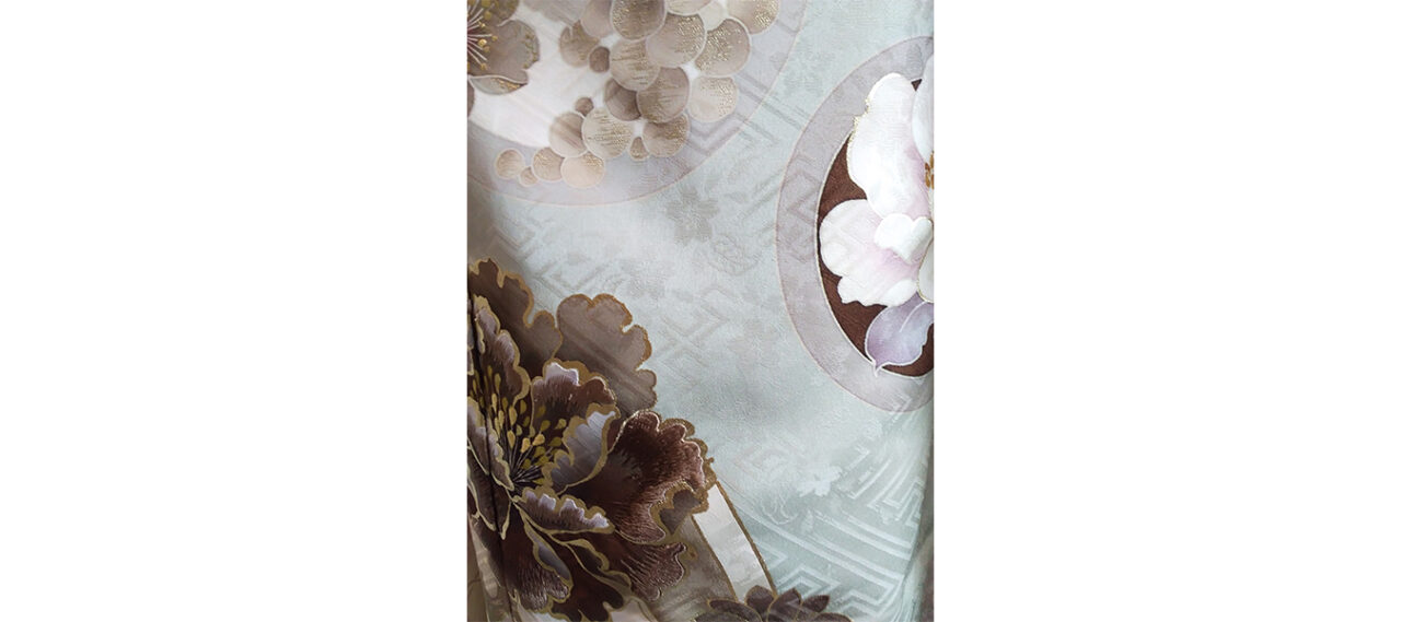 シャンパンベージュ地に家紋、梅、鶴が織り込まれた艶やかな生地に雪輪や牡丹が描... -