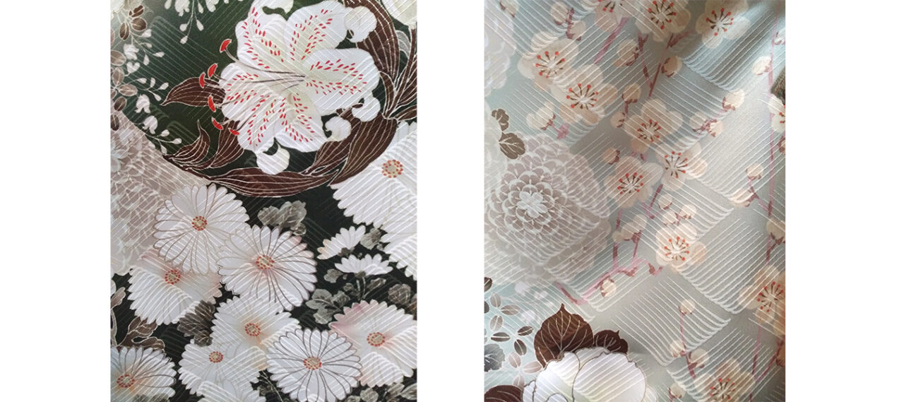 若緑色に梅、藤、百合、撫子、椿、何種もの菊、牡丹、桜などの花々が白をベースに... -