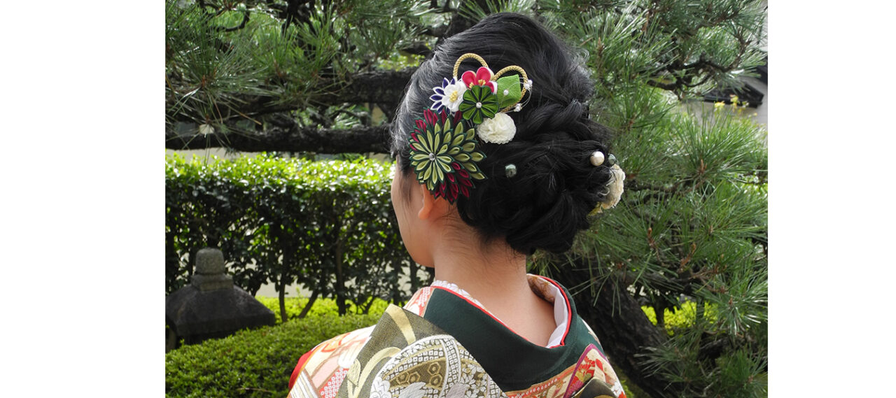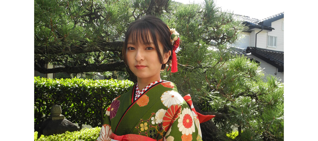 抹茶色に菊、麻の葉、菱亀甲が描かれたお振袖を選ばれたお嬢さま。 着物の柄は美し... -