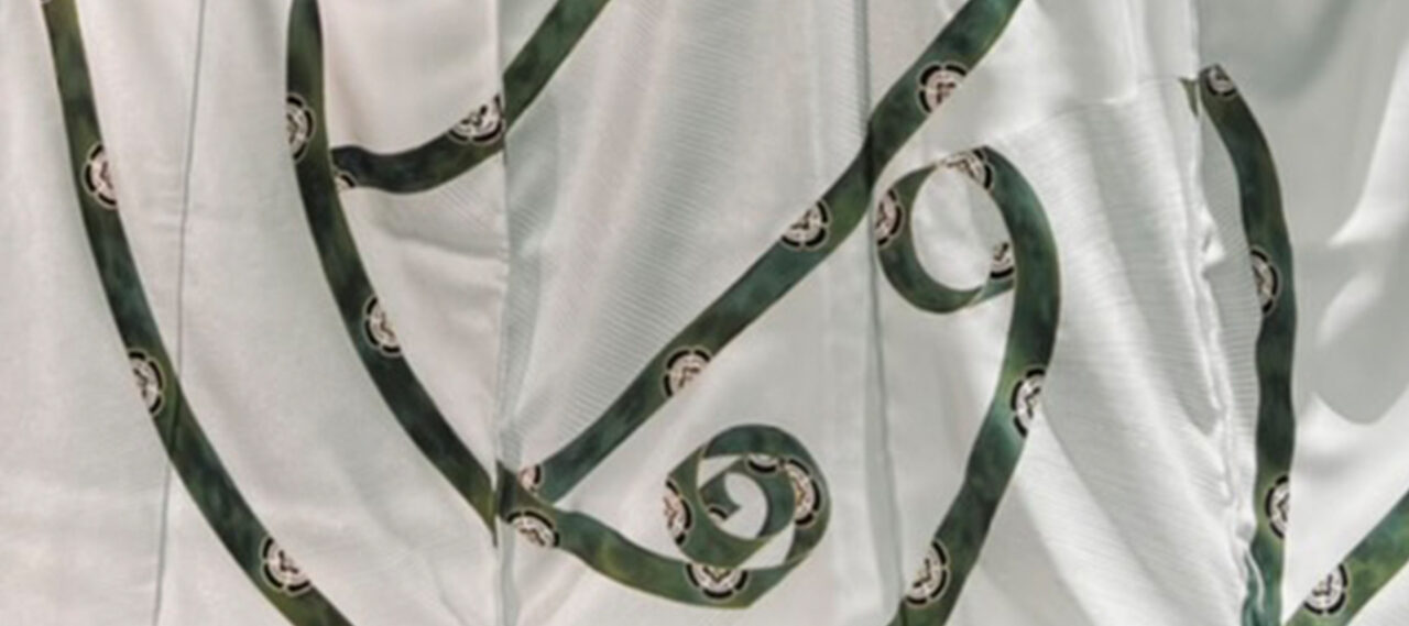 女信長と題名のついた訪問着 御簾の柄を全面に手書きで配しています。 御簾を調べ... -