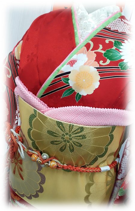 重ね衿は薄い緑と淡いピンクで可愛らしくしてみました。