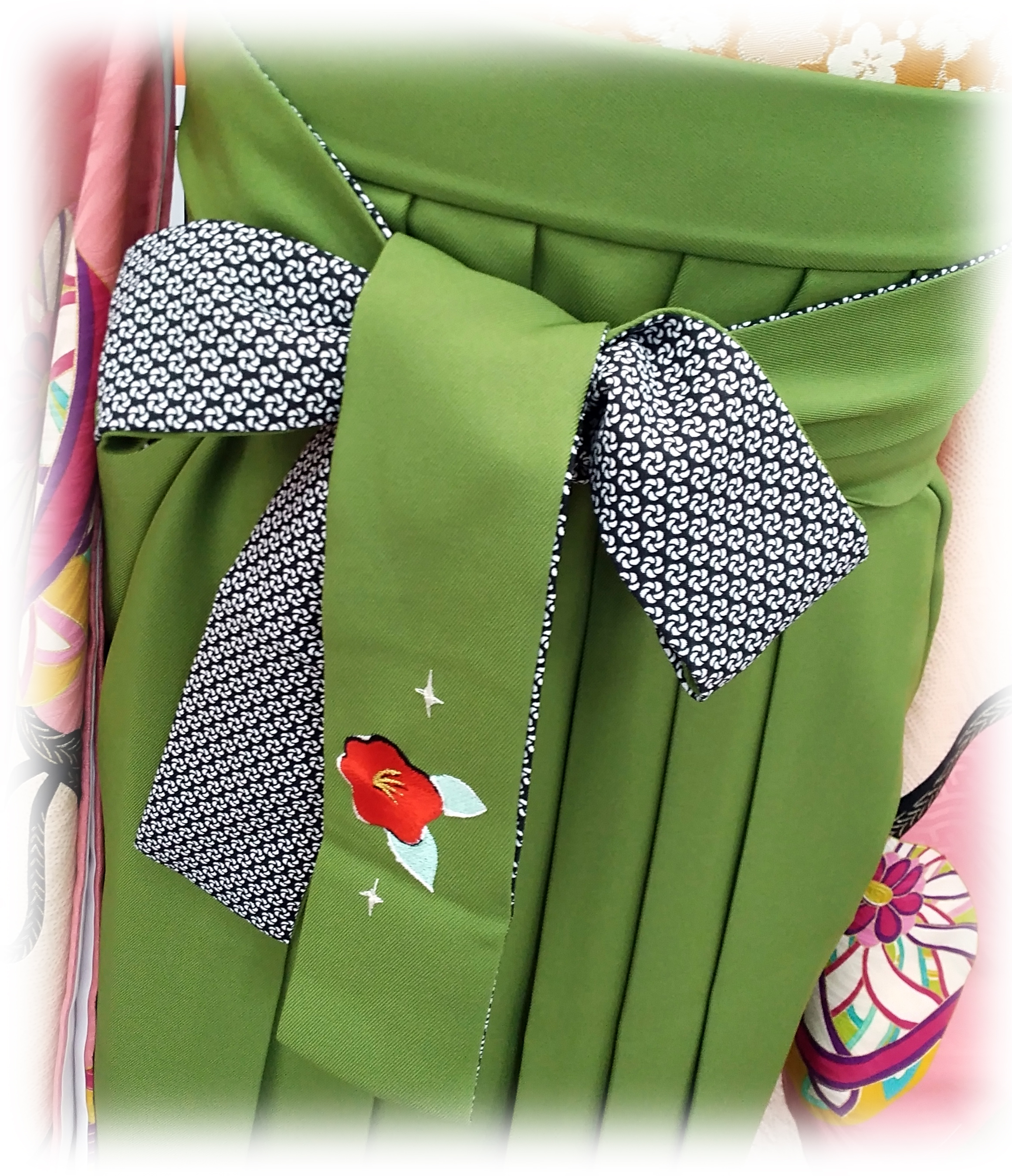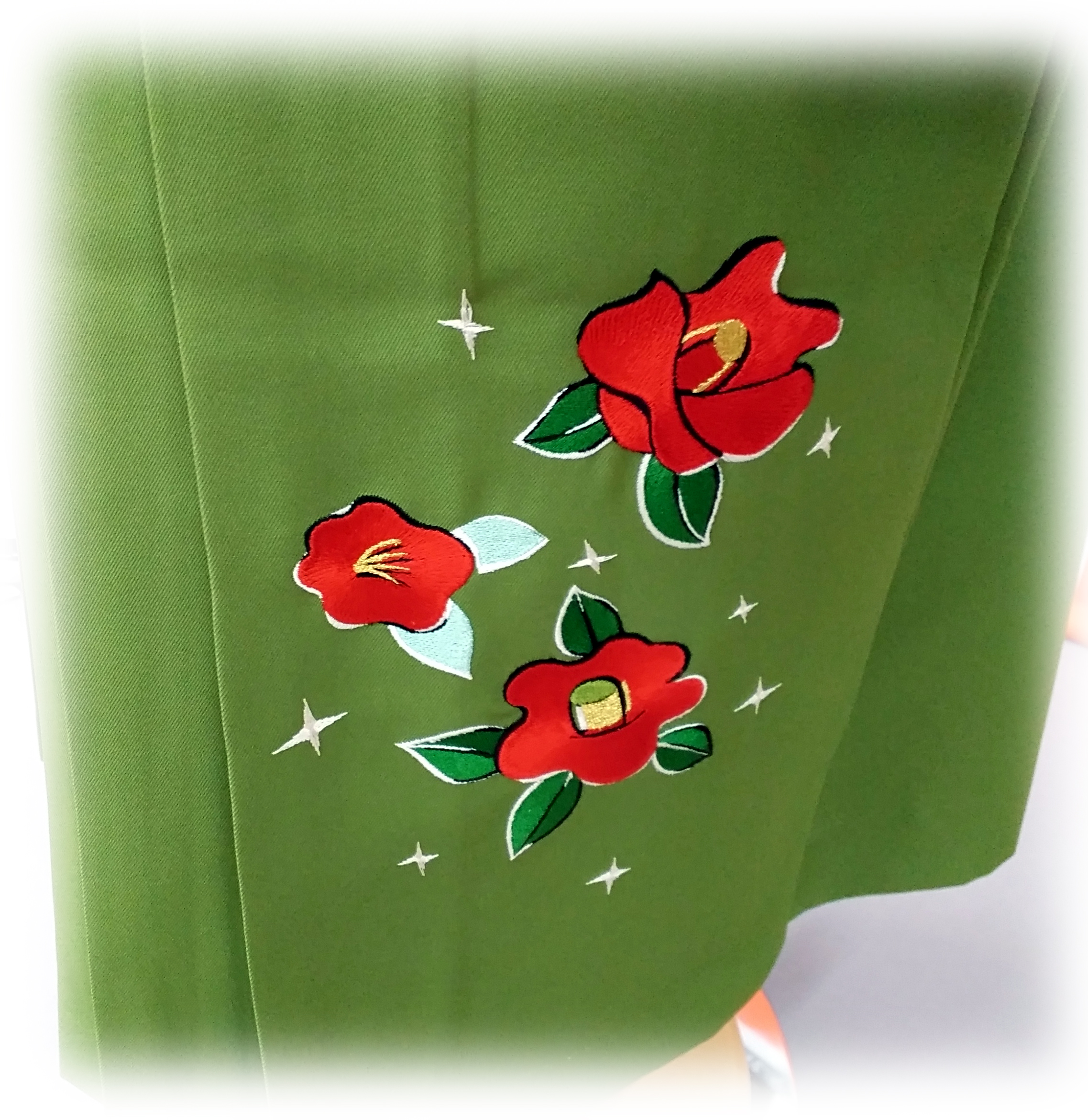 袴の裾の所と結ぶ紐の所に椿の刺繍がしてあります。