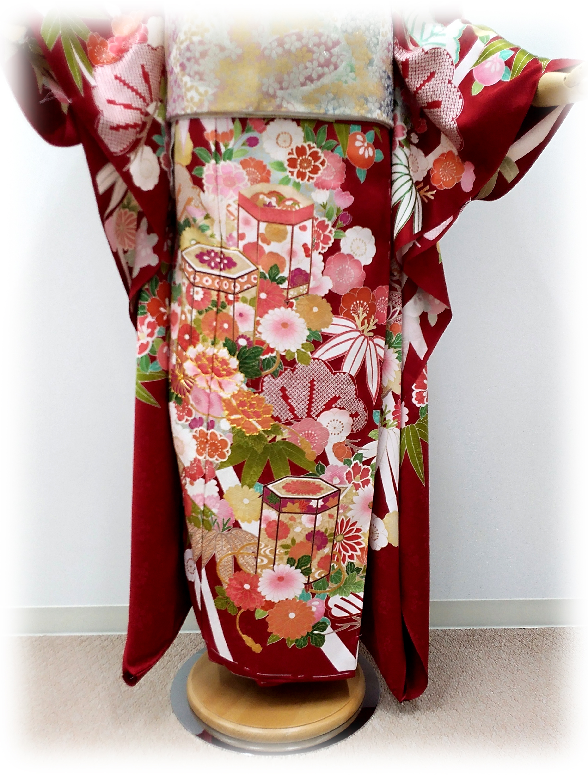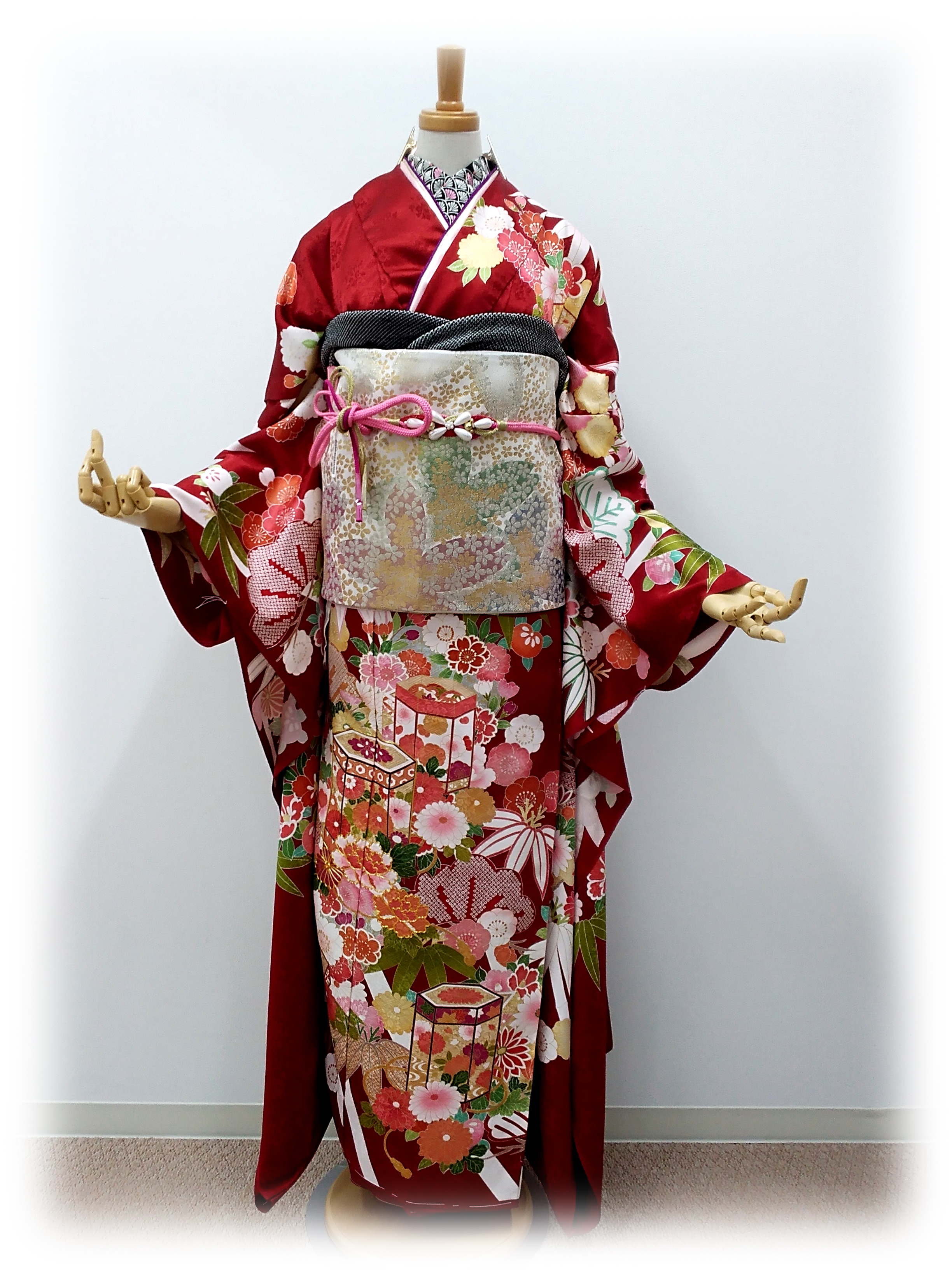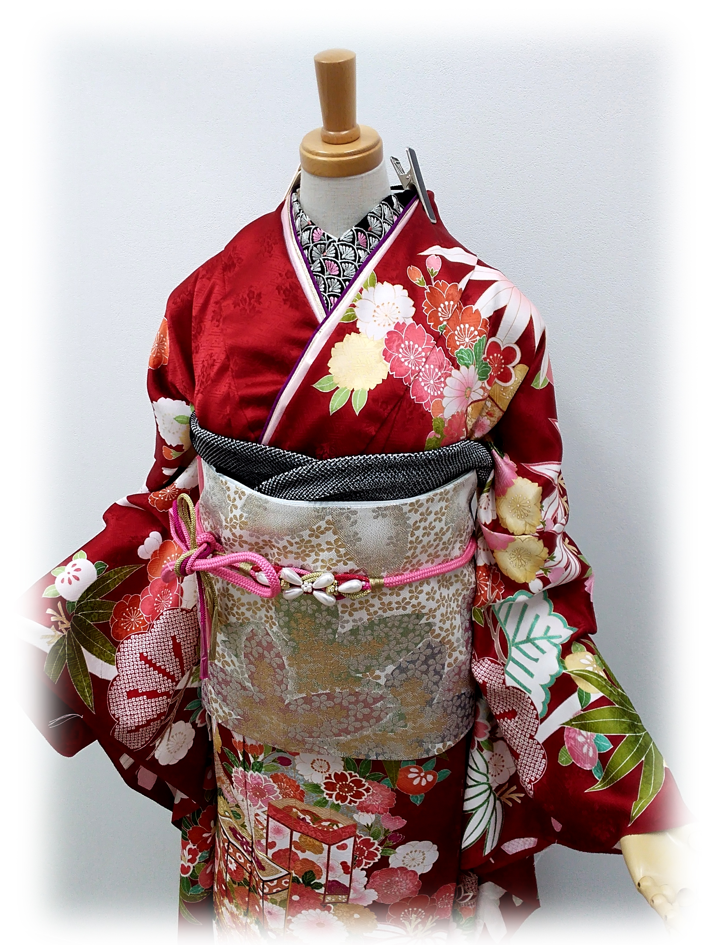 今日は、赤色振袖マネキンちゃんの かっこ可愛い 感じのコーディネートをご紹介です。
