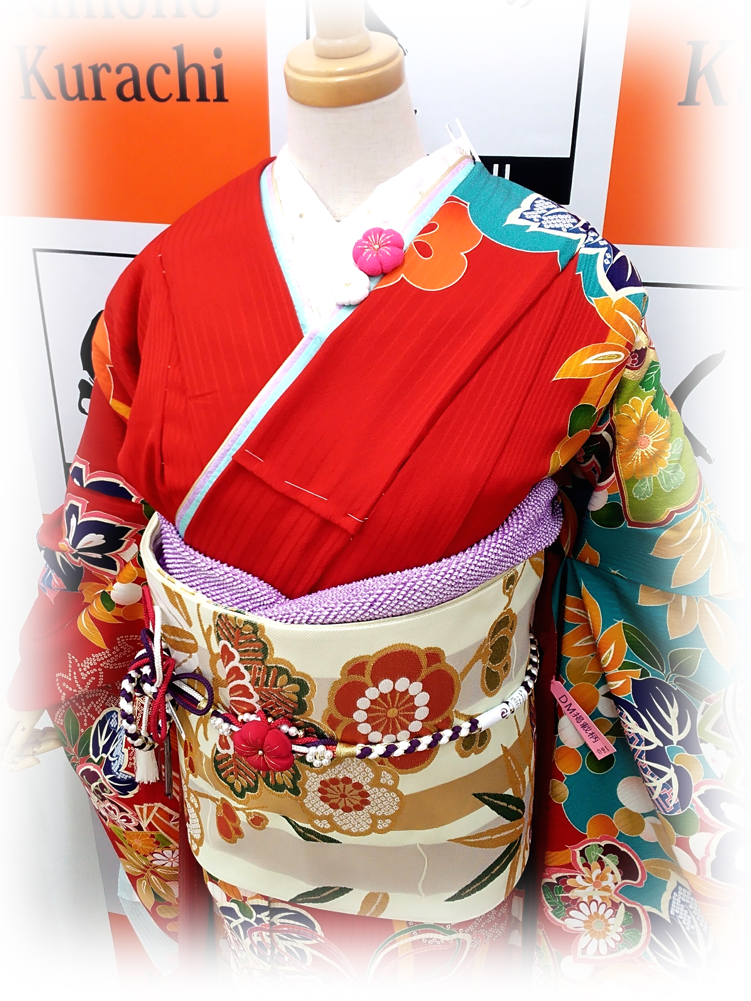 赤色のお振袖ですが、重ね衿や帯揚げ・帯締めでいかようにもテイストを変化させられるんですよ。