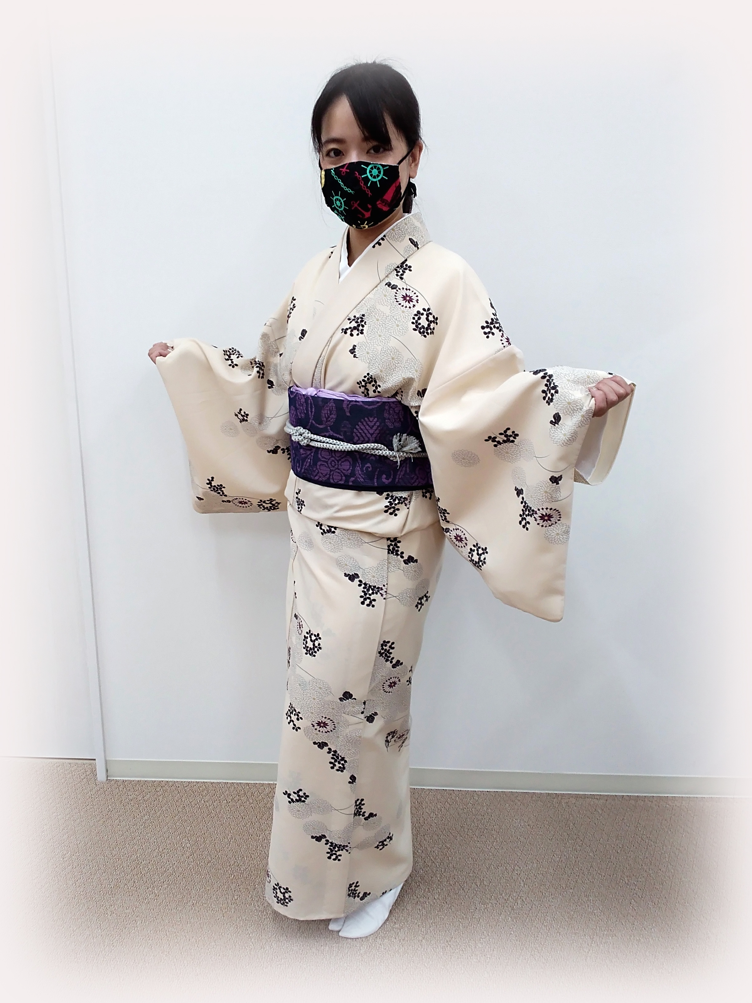 見にくいのですが、着物に紫色の柄が入っているので、帯と着物で統一感を狙ってみました!