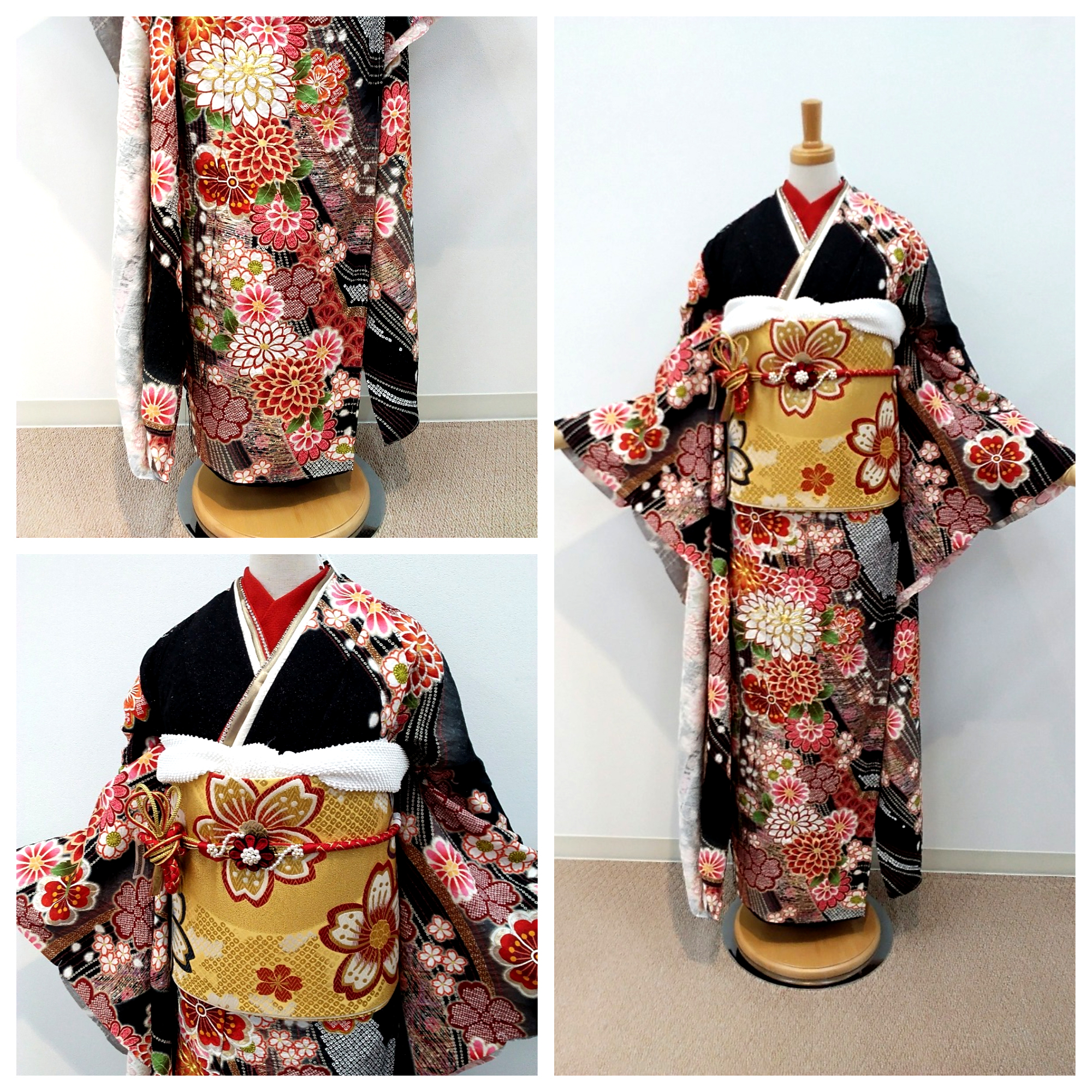 本日の振袖マネキンちゃんは、黒色のお振袖を着せてみました!