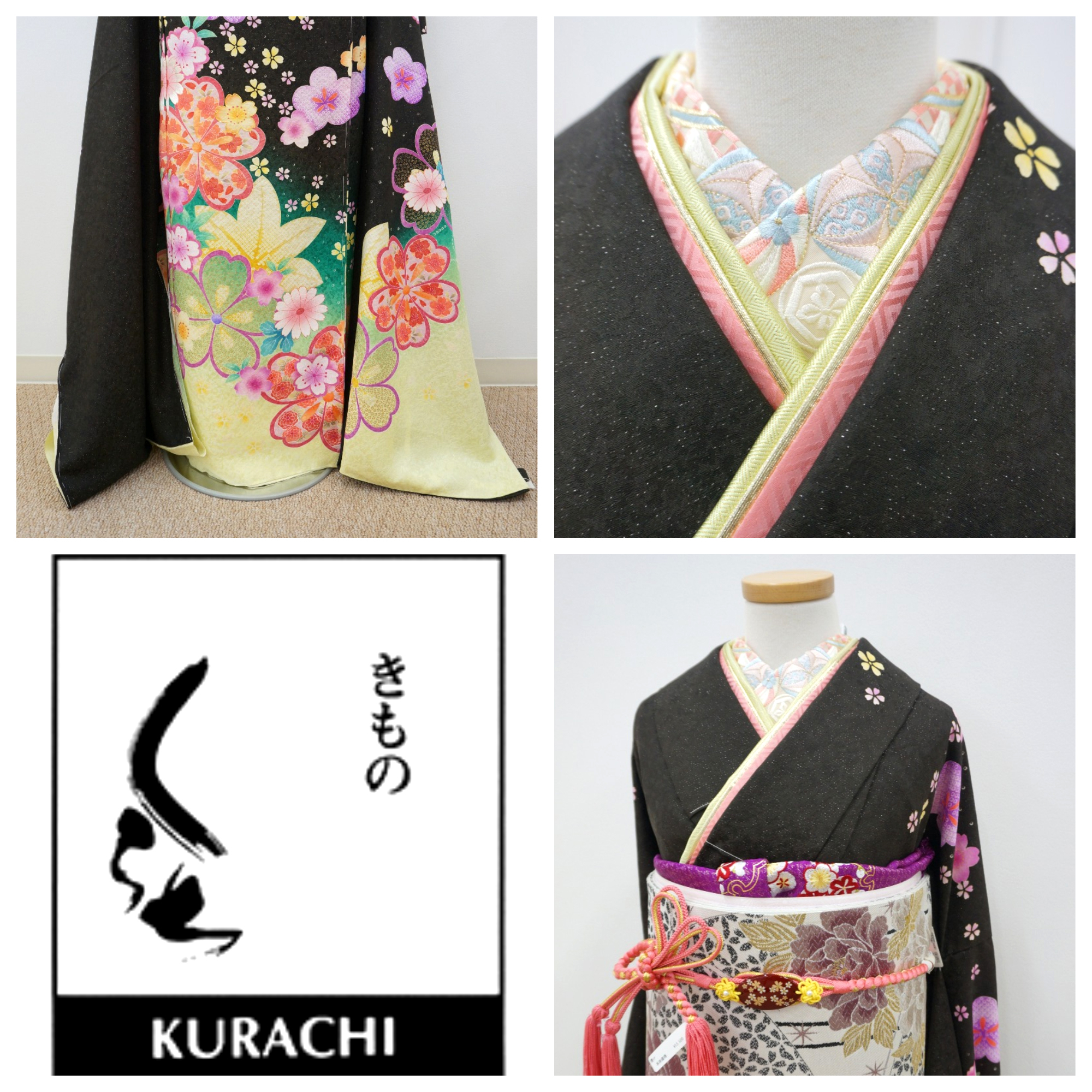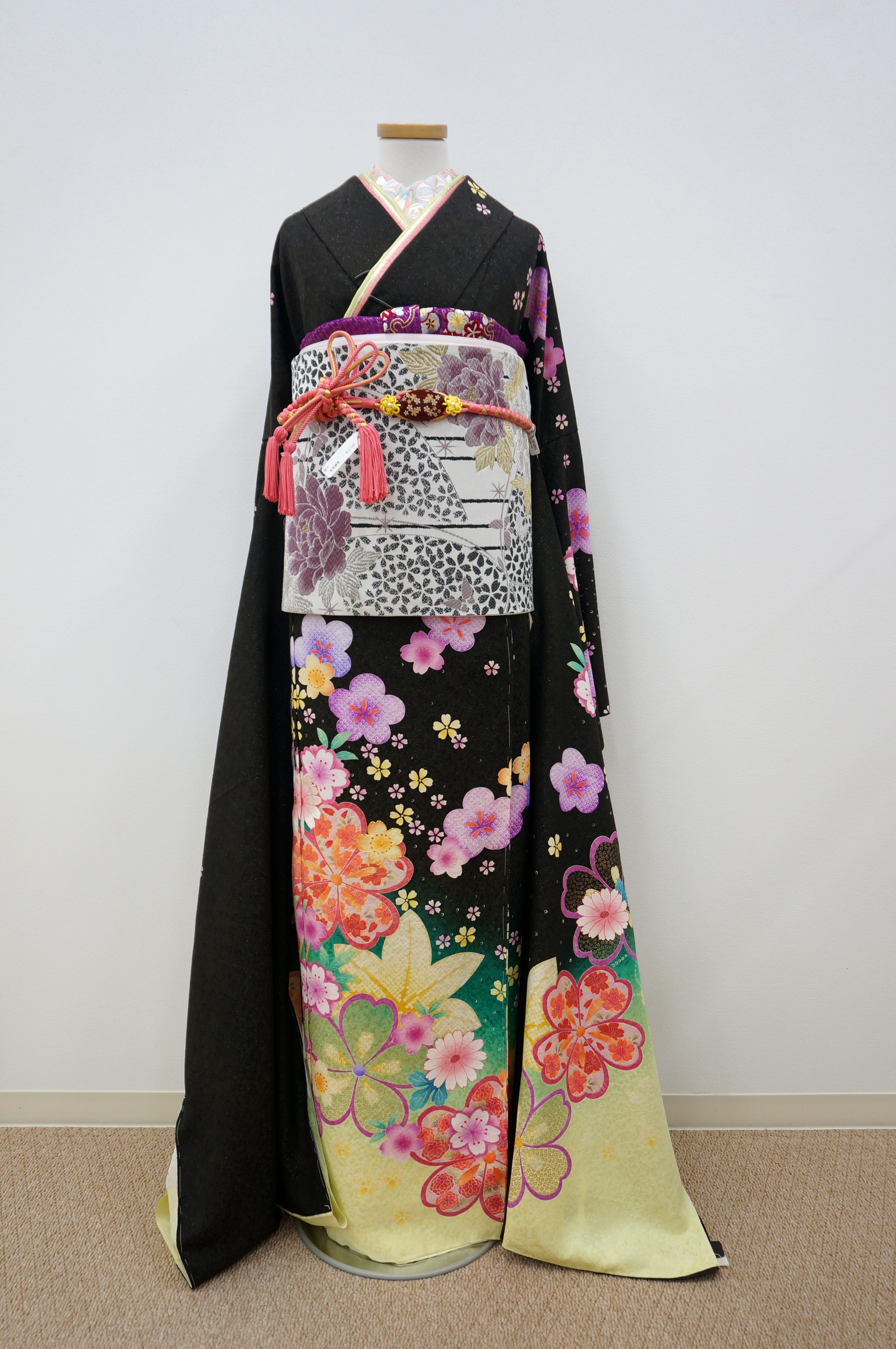 黒地のお振袖なのですが、裾に向かって明るいお色味が入っているので、柔らかい印象を受けます。