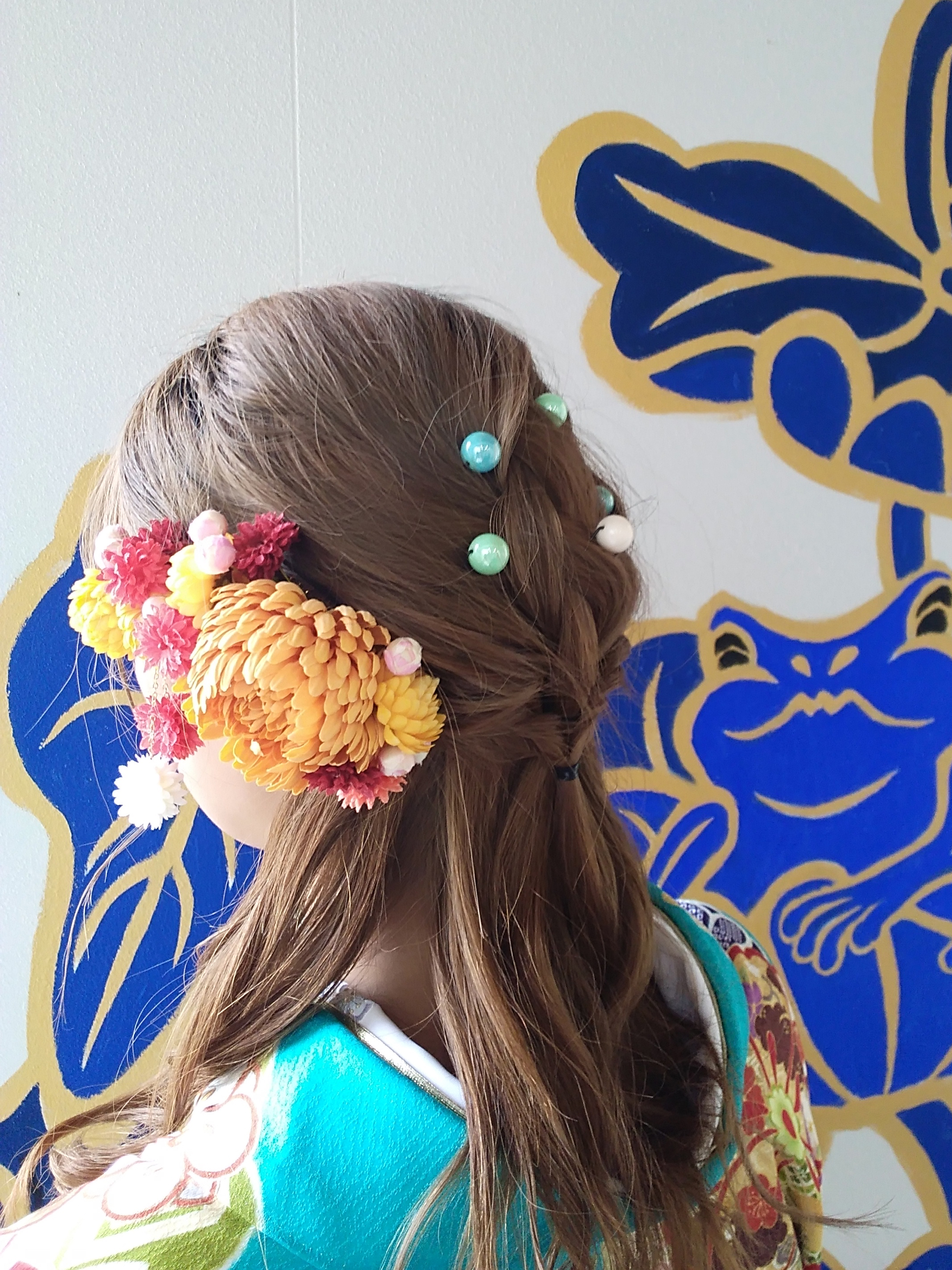 鮮やかな髪飾りが目を惹きます。