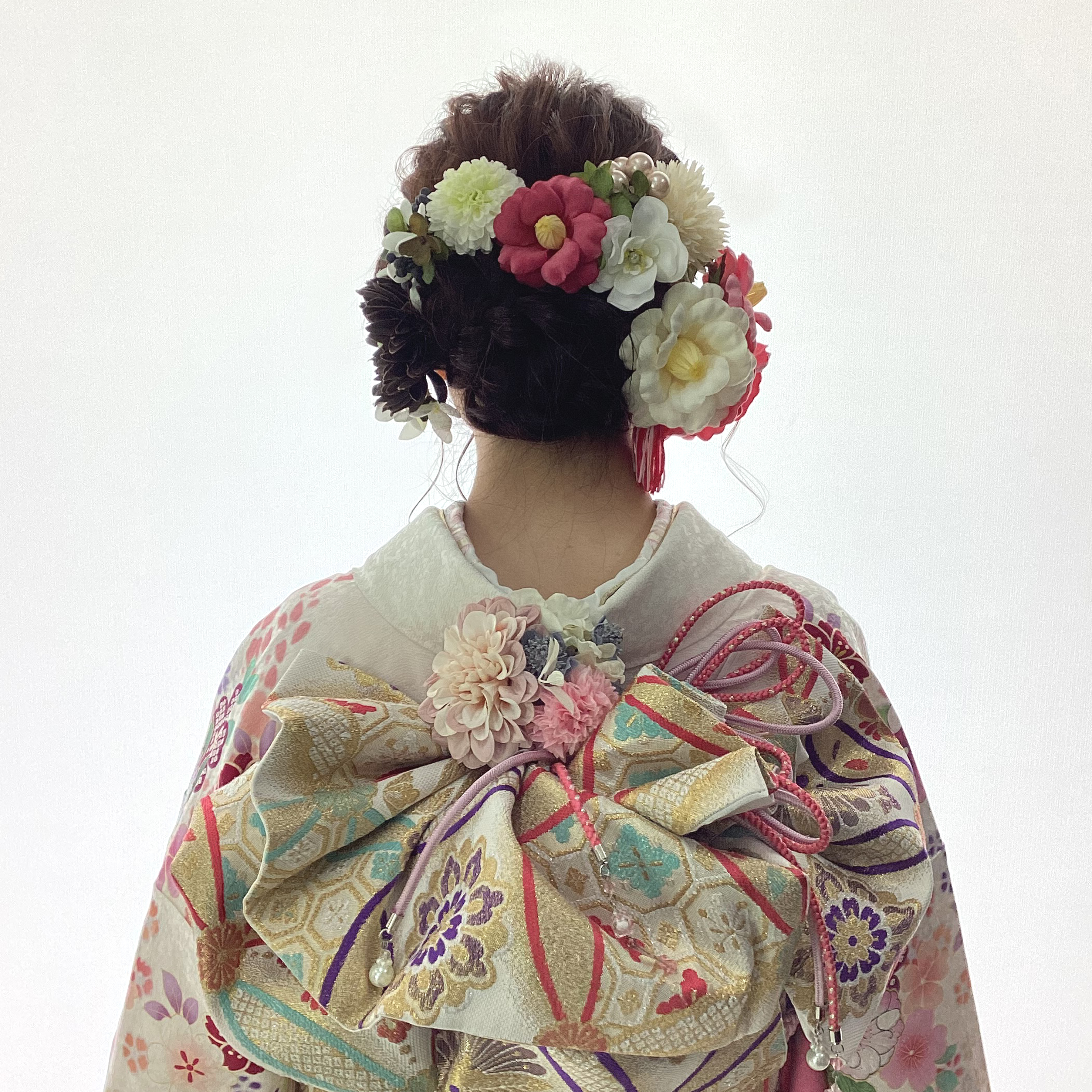 振袖に合わせて、白とピンクでまとめた髪飾り。