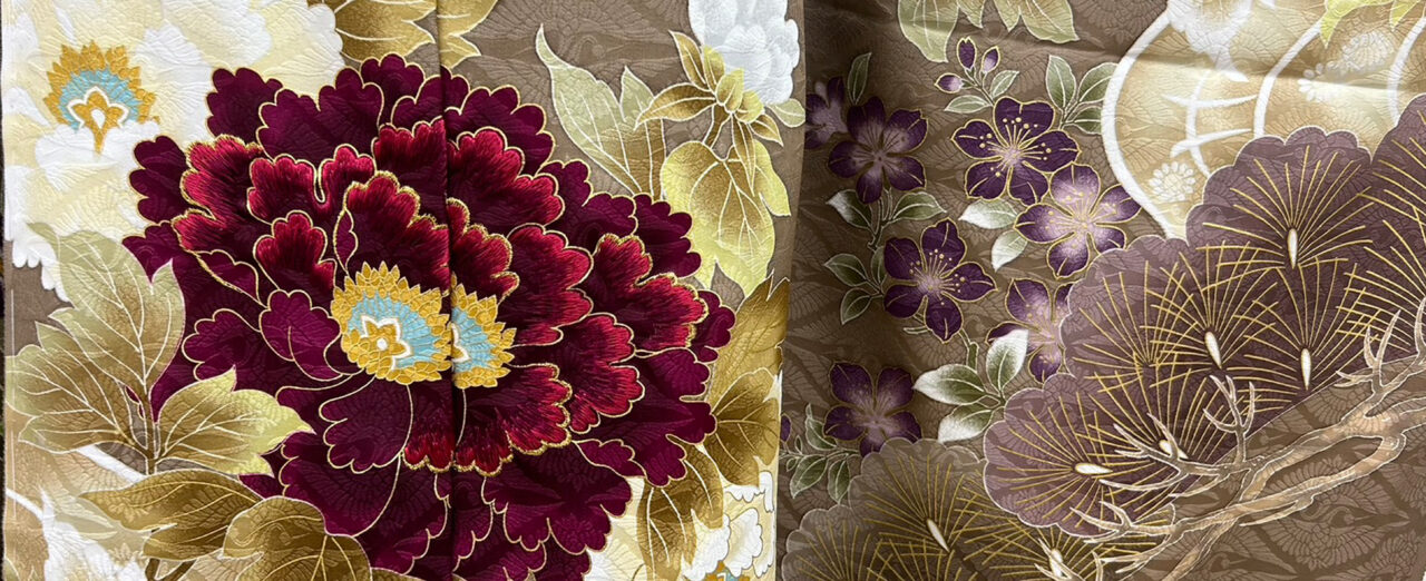 本日は振袖コーディネートのご紹介です。 優しい茶色地に、 牡丹と松が大きく描か...